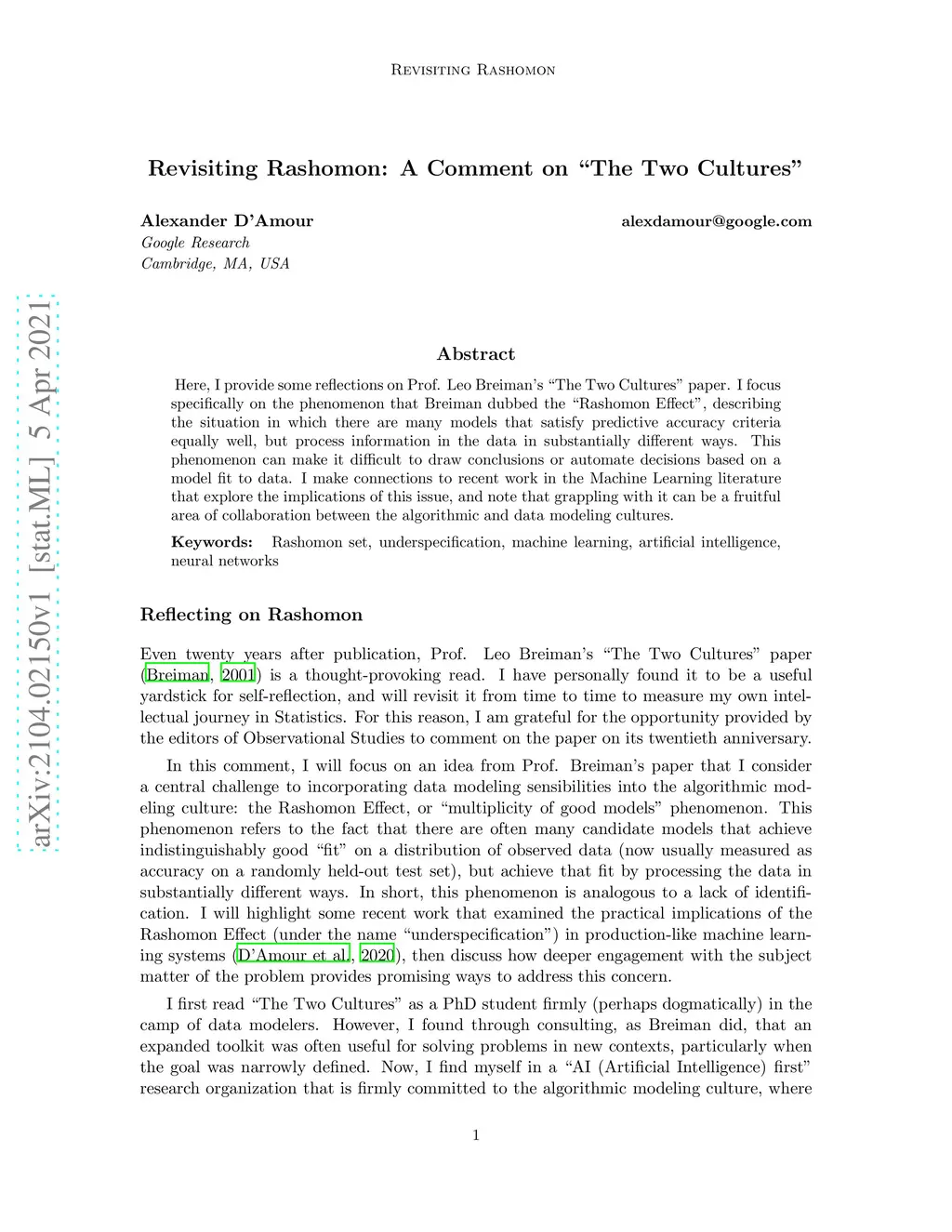 Here, I provide some reflections on Prof. Leo Breiman's "The Two Cultures" paper. I focus specifically on the phenomenon that Breiman dubbed the "Rashomon Effect", describing the situation in which there are many models that satisfy predictive accuracy criteria equally well, but process information in the data in substantially different ways. This phenomenon can make it difficult to draw conclusions or automate decisions based on a model fit to data. I make connections to recent work in the Machine Learning literature that explore the implications of this issue, and note that grappling with it can be a fruitful area of collaboration between the algorithmic and data modeling cultures.