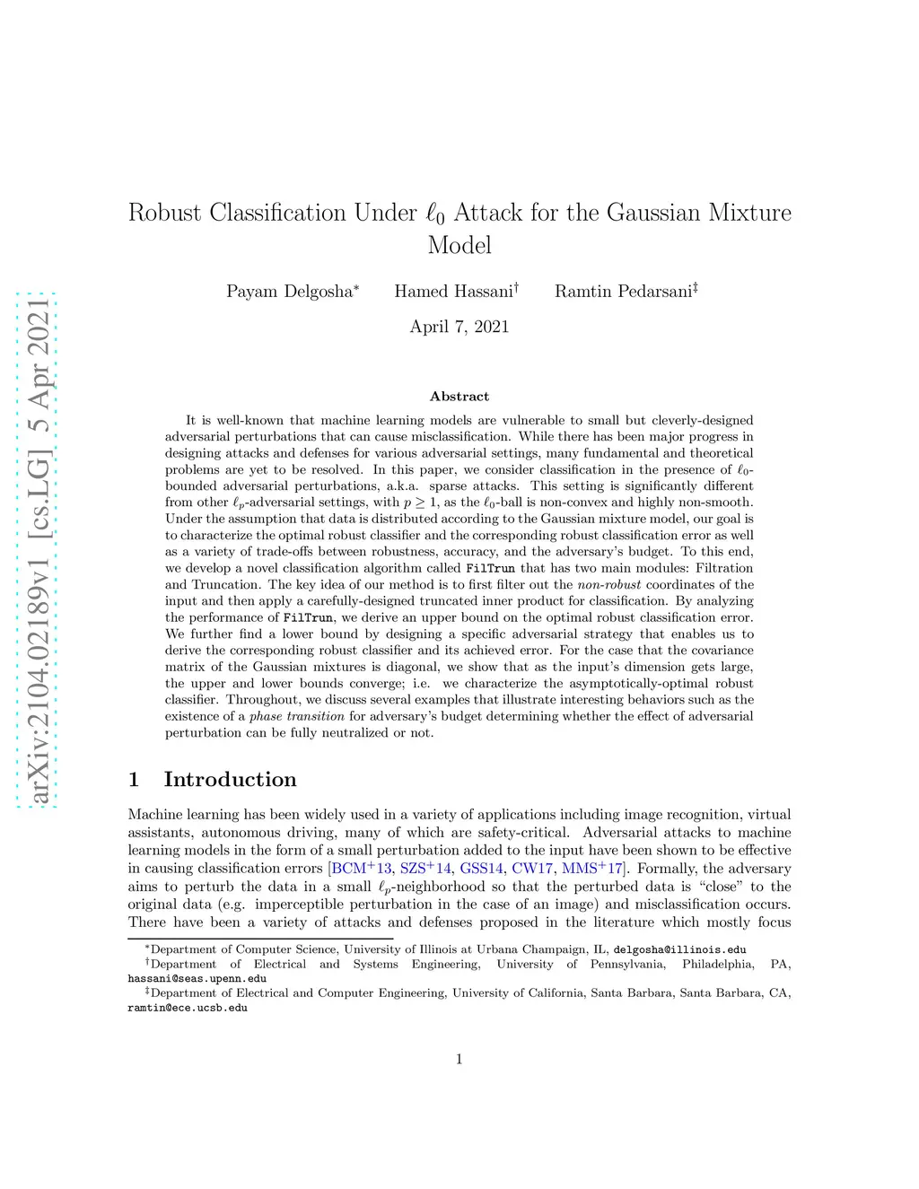 It is well-known that machine learning models are vulnerable to small but cleverly-designed adversarial perturbations that can cause misclassification. While there has been major progress in designing attacks and defenses for various adversarial settings, many fundamental and theoretical problems are yet to be resolved. In this paper, we consider classification in the presence of -bounded adversarial perturbations, a.k.a. sparse attacks. This setting is significantly different from other -adversarial settings, with , as the -ball is non-convex and highly non-smooth. Under the assumption that data is distributed according to the Gaussian mixture model, our goal is to characterize the optimal robust classifier and the corresponding robust classification error as well as a variety of trade-offs between robustness, accuracy, and the adversary's budget. To this end, we develop a novel classification algorithm called FilTrun that has two main modules: Filtration and Truncation. The key idea of our method is to first filter out the non-robust coordinates of the input and then apply a carefully-designed truncated inner product for classification. By analyzing the performance of FilTrun, we derive an upper bound on the optimal robust classification error. We also find a lower bound by designing a specific adversarial strategy that enables us to derive the corresponding robust classifier and its achieved error. For the case that the covariance matrix of the Gaussian mixtures is diagonal, we show that as the input's dimension gets large, the upper and lower bounds converge; i.e. we characterize the asymptotically-optimal robust classifier. Throughout, we discuss several examples that illustrate interesting behaviors such as the existence of a phase transition for adversary's budget determining whether the effect of adversarial perturbation can be fully neutralized.