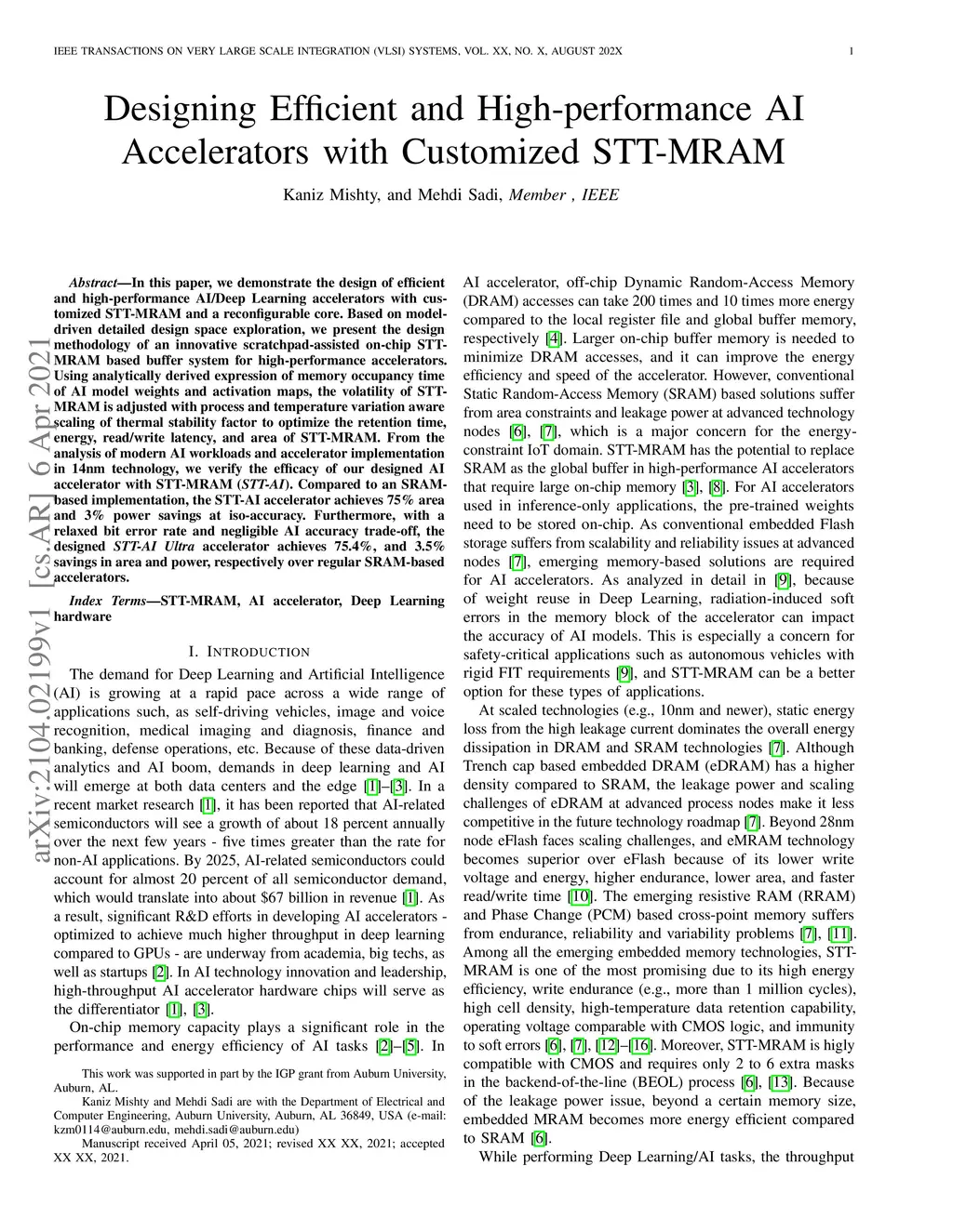 In this paper, we demonstrate the design of efficient and high-performance AI/Deep Learning accelerators with customized STT-MRAM and a reconfigurable core. Based on model-driven detailed design space exploration, we present the design methodology of an innovative scratchpad-assisted on-chip STT-MRAM based buffer system for high-performance accelerators. Using analytically derived expression of memory occupancy time of AI model weights and activation maps, the volatility of STT-MRAM is adjusted with process and temperature variation aware scaling of thermal stability factor to optimize the retention time, energy, read/write latency, and area of STT-MRAM. From the analysis of modern AI workloads and accelerator implementation in 14nm technology, we verify the efficacy of our designed AI accelerator with STT-MRAM STT-AI. Compared to an SRAM-based implementation, the STT-AI accelerator achieves 75% area and 3% power savings at iso-accuracy. Furthermore, with a relaxed bit error rate and negligible AI accuracy trade-off, the designed STT-AI Ultra accelerator achieves 75.4%, and 3.5% savings in area and power, respectively over regular SRAM-based accelerators.