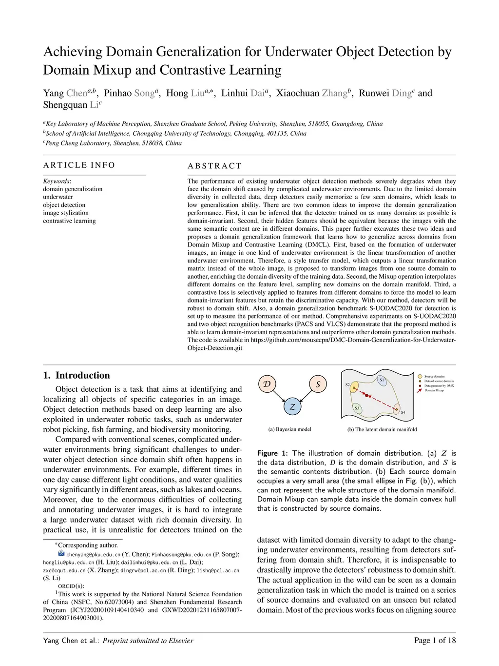 The performance of existing underwater object detection methods degrades seriously when facing domain shift caused by complicated underwater environments. Due to the limitation of the number of domains in the dataset, deep detectors easily memorize a few seen domains, which leads to low generalization ability. There are two common ideas to improve the domain generalization performance. First, it can be inferred that the detector trained on as many domains as possible is domain-invariant. Second, for the images with the same semantic content in different domains, their hidden features should be equivalent. This paper further excavates these two ideas and proposes a domain generalization framework (named DMC) that learns how to generalize across domains from Domain Mixup and Contrastive Learning. First, based on the formation of underwater images, an image in an underwater environment is the linear transformation of another underwater environment. Thus, a style transfer model, which outputs a linear transformation matrix instead of the whole image, is proposed to transform images from one source domain to another, enriching the domain diversity of the training data. Second, mixup operation interpolates different domains on the feature level, sampling new domains on the domain manifold. Third, contrastive loss is selectively applied to features from different domains to force the model to learn domain invariant features but retain the discriminative capacity. With our method, detectors will be robust to domain shift. Also, a domain generalization benchmark S-UODAC2020 for detection is set up to measure the performance of our method. Comprehensive experiments on S-UODAC2020 and two object recognition benchmarks (PACS and VLCS) demonstrate that the proposed method is able to learn domain-invariant representations, and outperforms other domain generalization methods.