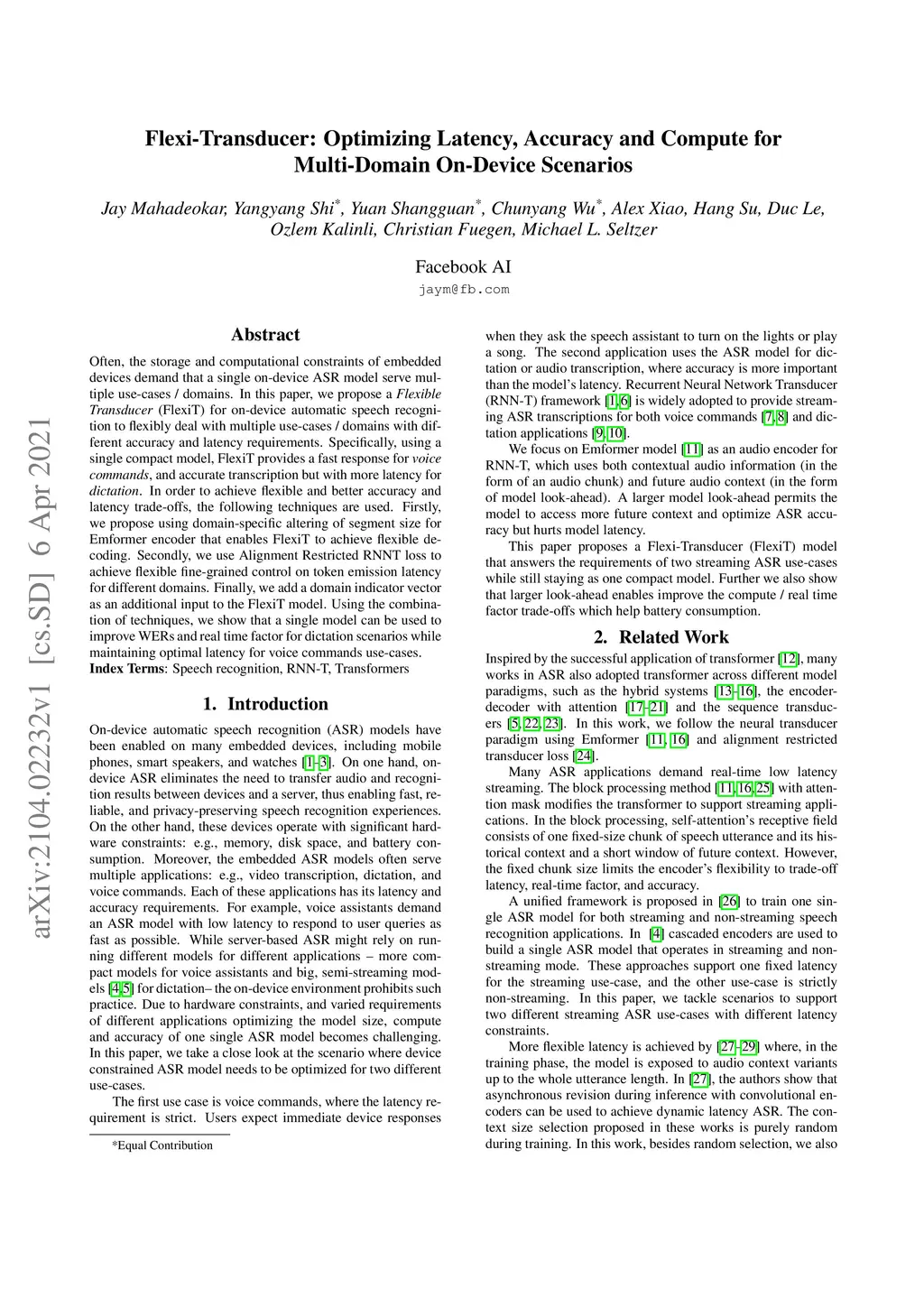 Often, the storage and computational constraints of embeddeddevices demand that a single on-device ASR model serve multiple use-cases / domains. In this paper, we propose aFlexibleTransducer(FlexiT) for on-device automatic speech recognition to flexibly deal with multiple use-cases / domains with different accuracy and latency requirements. Specifically, using a single compact model, FlexiT provides a fast response for voice commands, and accurate transcription but with more latency for dictation. In order to achieve flexible and better accuracy and latency trade-offs, the following techniques are used. Firstly, we propose using domain-specific altering of segment size for Emformer encoder that enables FlexiT to achieve flexible de-coding. Secondly, we use Alignment Restricted RNNT loss to achieve flexible fine-grained control on token emission latency for different domains. Finally, we add a domain indicator vector as an additional input to the FlexiT model. Using the combination of techniques, we show that a single model can be used to improve WERs and real time factor for dictation scenarios while maintaining optimal latency for voice commands use-cases