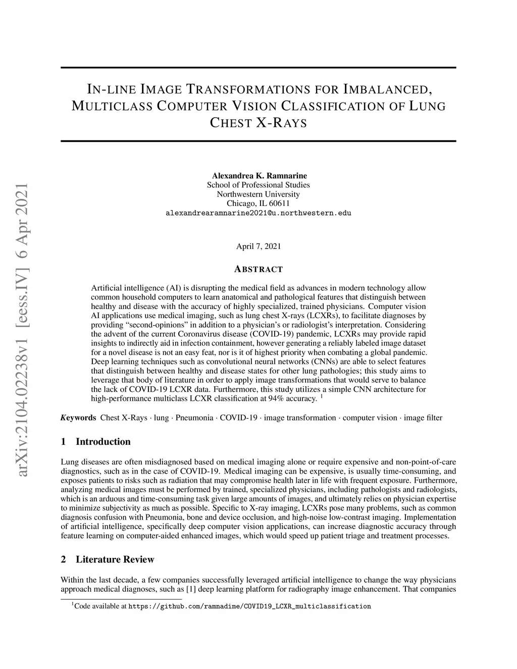 Artificial intelligence (AI) is disrupting the medical field as advances in modern technology allow common household computers to learn anatomical and pathological features that distinguish between healthy and disease with the accuracy of highly specialized, trained physicians. Computer vision AI applications use medical imaging, such as lung chest X-Rays (LCXRs), to facilitate diagnoses by providing second-opinions in addition to a physician's or radiologist's interpretation. Considering the advent of the current Coronavirus disease (COVID-19) pandemic, LCXRs may provide rapid insights to indirectly aid in infection containment, however generating a reliably labeled image dataset for a novel disease is not an easy feat, nor is it of highest priority when combating a global pandemic. Deep learning techniques such as convolutional neural networks (CNNs) are able to select features that distinguish between healthy and disease states for other lung pathologies; this study aims to leverage that body of literature in order to apply image transformations that would serve to balance the lack of COVID-19 LCXR data. Furthermore, this study utilizes a simple CNN architecture for high-performance multiclass LCXR classification at 94 percent accuracy.