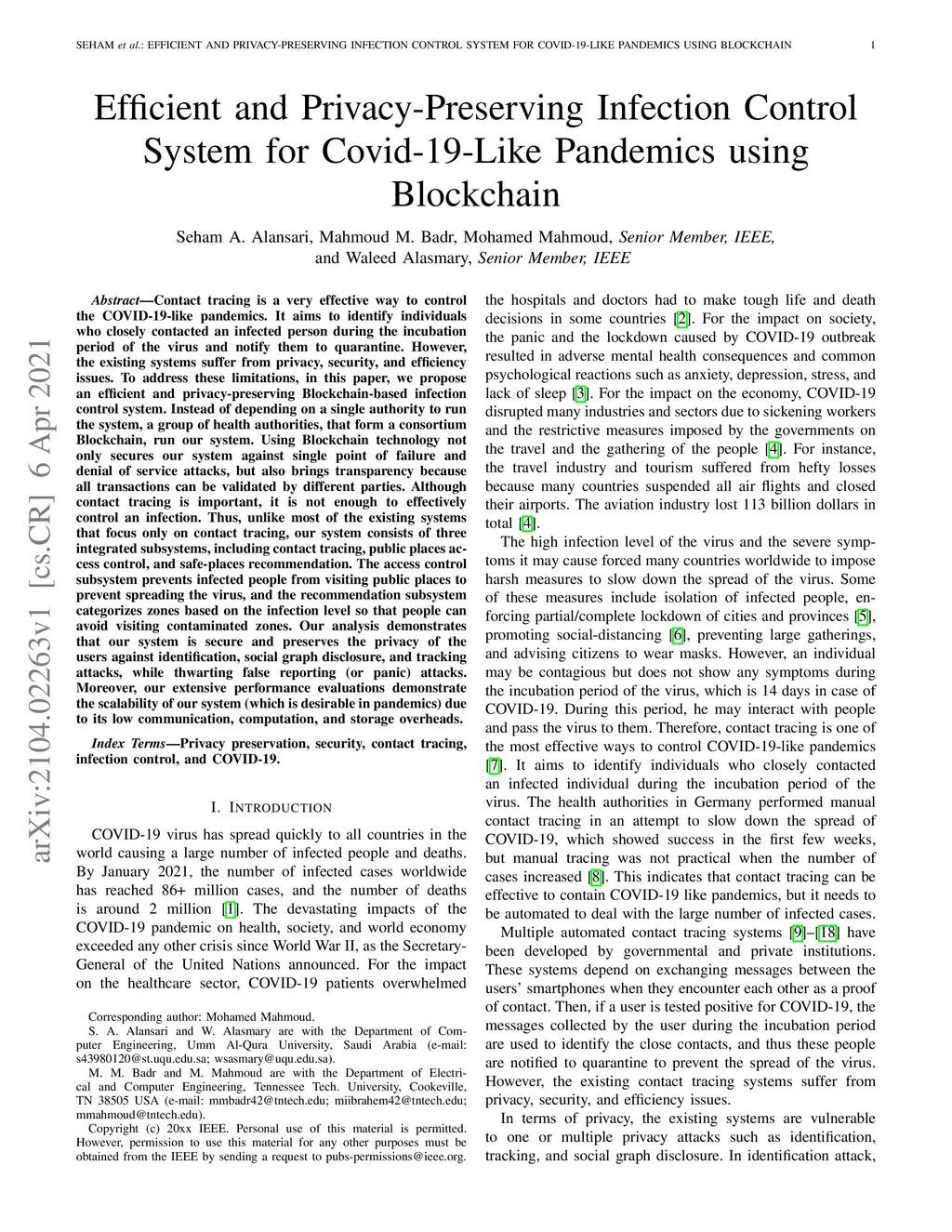Contact tracing is a very effective way to control the COVID-19-like pandemics. It aims to identify individuals who closely contacted an infected person during the incubation period of the virus and notify them to quarantine. However, the existing systems suffer from privacy, security, and efficiency issues. To address these limitations, in this paper, we propose an efficient and privacy-preserving Blockchain-based infection control system. Instead of depending on a single authority to run the system, a group of health authorities, that form a consortium Blockchain, run our system. Using Blockchain technology not only secures our system against single point of failure and denial of service attacks, but also brings transparency because all transactions can be validated by different parties. Although contact tracing is important, it is not enough to effectively control an infection. Thus, unlike most of the existing systems that focus only on contact tracing, our system consists of three integrated subsystems, including contact tracing, public places access control, and safe-places recommendation. The access control subsystem prevents infected people from visiting public places to prevent spreading the virus, and the recommendation subsystem categorizes zones based on the infection level so that people can avoid visiting contaminated zones. Our analysis demonstrates that our system is secure and preserves the privacy of the users against identification, social graph disclosure, and tracking attacks, while thwarting false reporting (or panic) attacks. Moreover, our extensive performance evaluations demonstrate the scalability of our system (which is desirable in pandemics) due to its low communication, computation, and storage overheads.