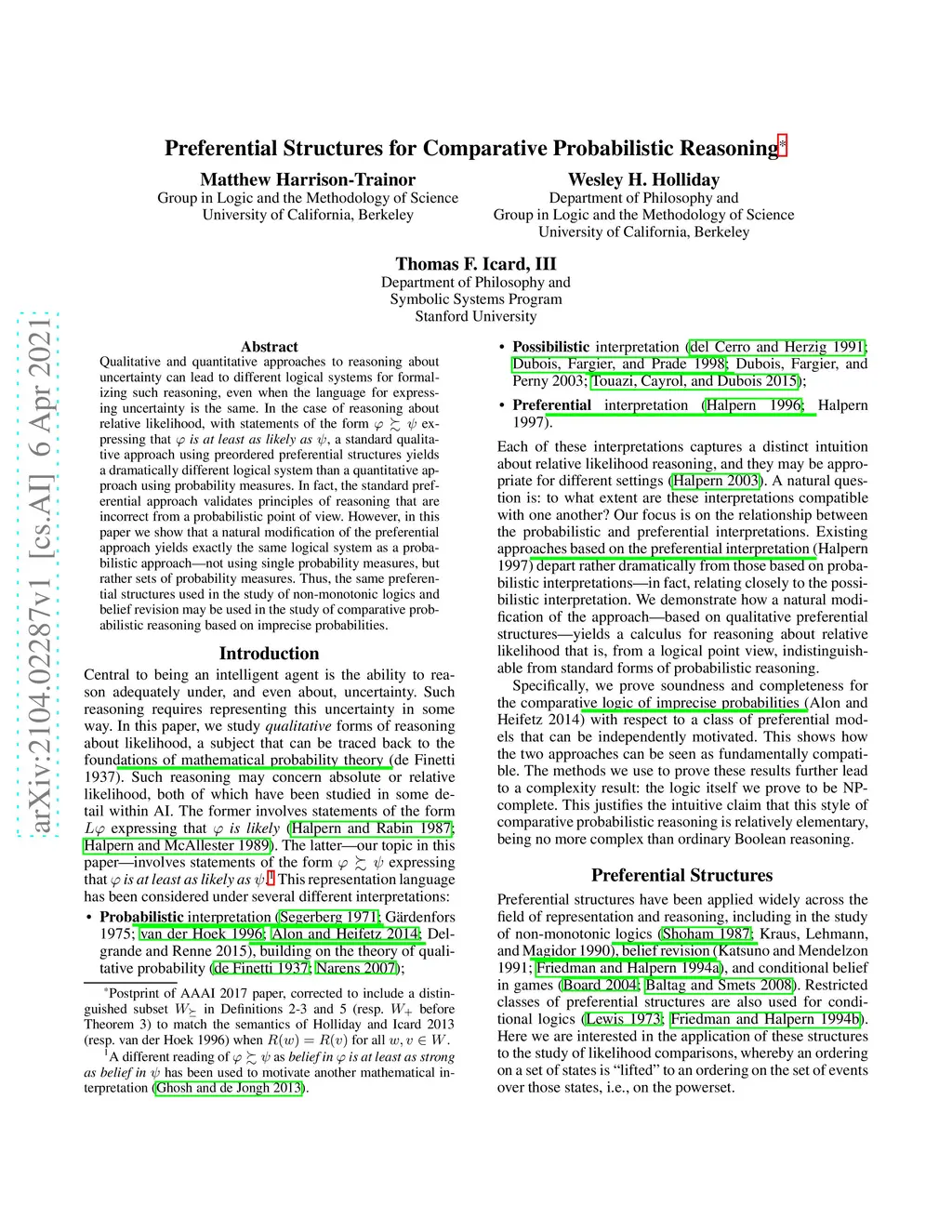 Qualitative and quantitative approaches to reasoning about uncertainty can lead to different logical systems for formalizing such reasoning, even when the language for expressing uncertainty is the same. In the case of reasoning about relative likelihood, with statements of the form expressing that is at least as likely as , a standard qualitative approach using preordered preferential structures yields a dramatically different logical system than a quantitative approach using probability measures. In fact, the standard preferential approach validates principles of reasoning that are incorrect from a probabilistic point of view. However, in this paper we show that a natural modification of the preferential approach yields exactly the same logical system as a probabilistic approach--not using single probability measures, but rather sets of probability measures. Thus, the same preferential structures used in the study of non-monotonic logics and belief revision may be used in the study of comparative probabilistic reasoning based on imprecise probabilities.