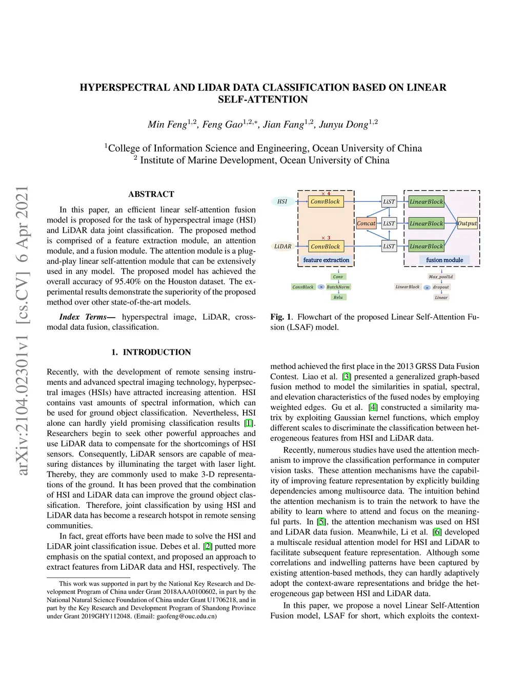 An efficient linear self-attention fusion model is proposed in this paper for the task of hyperspectral image (HSI) and LiDAR data joint classification. The proposed method is comprised of a feature extraction module, an attention module, and a fusion module. The attention module is a plug-and-play linear self-attention module that can be extensively used in any model. The proposed model has achieved the overall accuracy of 95.40\% on the Houston dataset. The experimental results demonstrate the superiority of the proposed method over other state-of-the-art models.