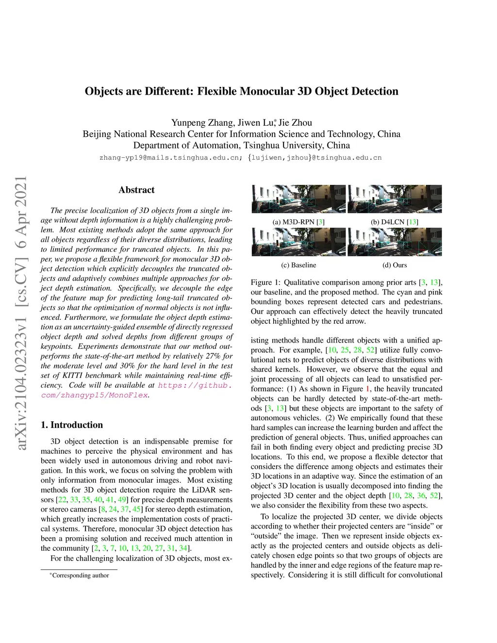 The precise localization of 3D objects from a single image without depth information is a highly challenging problem. Most existing methods adopt the same approach for all objects regardless of their diverse distributions, leading to limited performance for truncated objects. In this paper, we propose a flexible framework for monocular 3D object detection which explicitly decouples the truncated objects and adaptively combines multiple approaches for object depth estimation. Specifically, we decouple the edge of the feature map for predicting long-tail truncated objects so that the optimization of normal objects is not influenced. Furthermore, we formulate the object depth estimation as an uncertainty-guided ensemble of directly regressed object depth and solved depths from different groups of keypoints. Experiments demonstrate that our method outperforms the state-of-the-art method by relatively 27\% for the moderate level and 30\% for the hard level in the test set of KITTI benchmark while maintaining real-time efficiency. Code will be available at \url{https://github.com/zhangyp15/MonoFlex}.