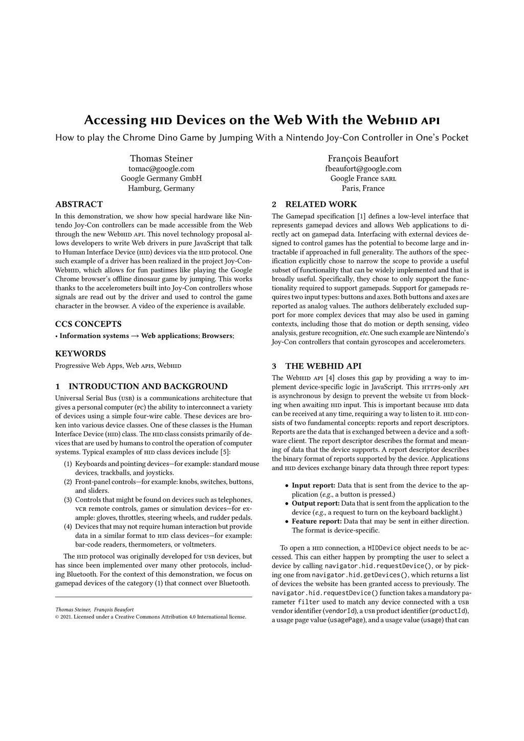 In this demonstration, we show how special hardware like Nintendo Joy-Con controllers can be made accessible from the Web through the new WebHID API. This novel technology proposal allows developers to write Web drivers in pure JavaScript that talk to Human Interface Device (HID) devices via the HID protocol. One such example of a driver has been realized in the project Joy-Con-WebHID, which allows for fun pastimes like playing the Google Chrome browser's offline dinosaur game by jumping. This works thanks to the accelerometers built into Joy-Con controllers whose signals are read out by the driver and used to control the game character in the browser. A video of the experience is available.