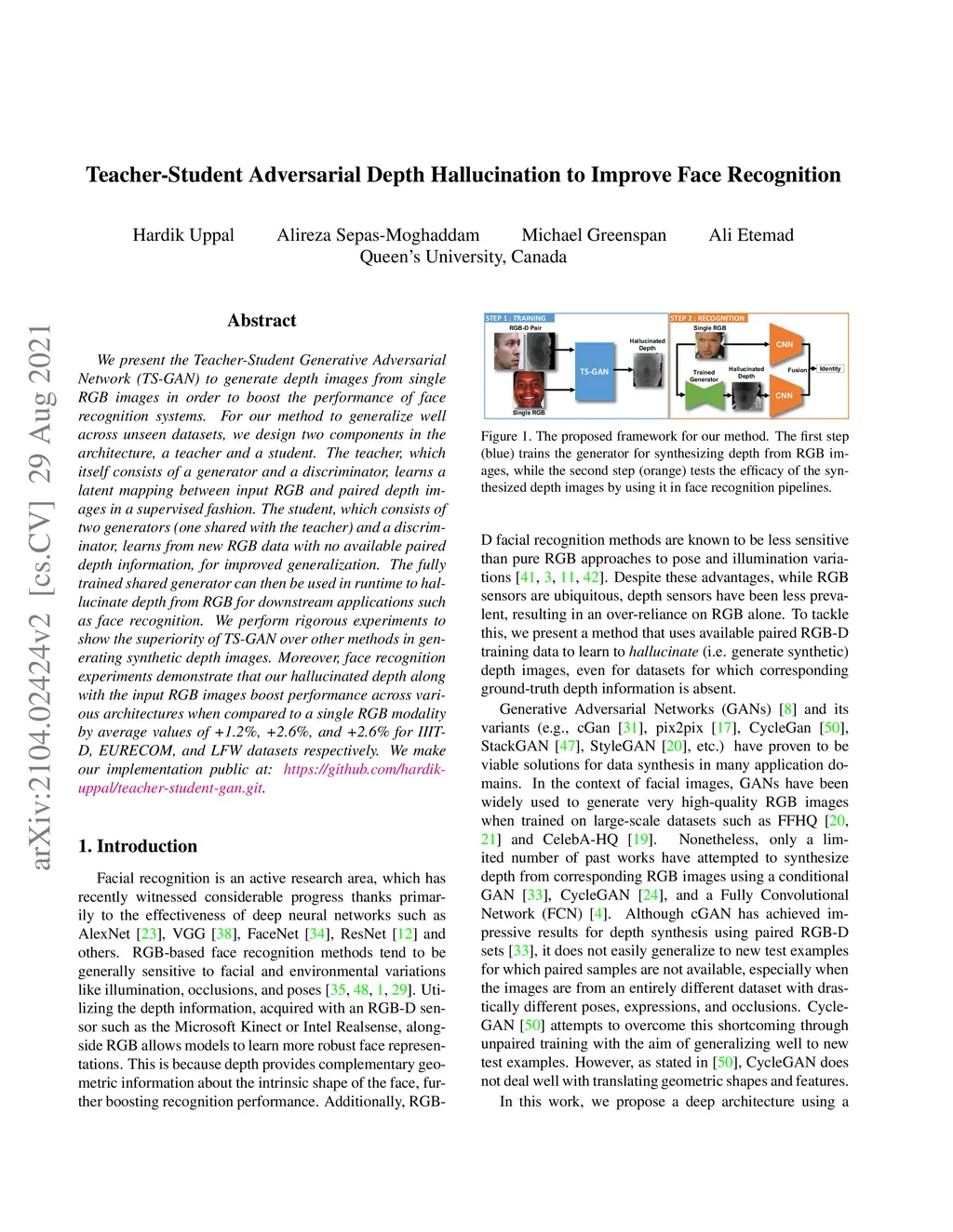 Teacher-Student Adversarial Depth Hallucination to Improve Face