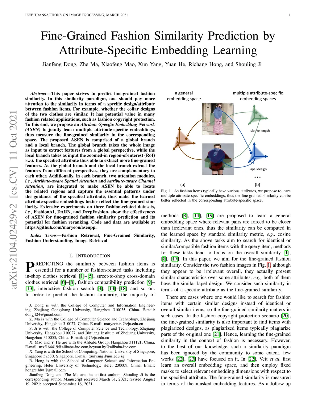 This paper strives to predict fine-grained fashion similarity. In this similarity paradigm, one should pay more attention to the similarity in terms of a specific design/attribute between fashion items. For example, whether the collar designs of the two clothes are similar. It has potential value in many fashion related applications, such as fashion copyright protection. To this end, we propose an Attribute-Specific Embedding Network (ASEN) to jointly learn multiple attribute-specific embeddings, thus measure the fine-grained similarity in the corresponding space. The proposed ASEN is comprised of a global branch and a local branch. The global branch takes the whole image as input to extract features from a global perspective, while the local branch takes as input the zoomed-in region-of-interest (RoI) w.r.t. the specified attribute thus able to extract more fine-grained features. As the global branch and the local branch extract the features from different perspectives, they are complementary to each other. Additionally, in each branch, two attention modules, i.e., Attribute-aware Spatial Attention and Attribute-aware Channel Attention, are integrated to make ASEN be able to locate the related regions and capture the essential patterns under the guidance of the specified attribute, thus make the learned attribute-specific embeddings better reflect the fine-grained similarity. Extensive experiments on three fashion-related datasets, i.e., FashionAI, DARN, and DeepFashion, show the effectiveness of ASEN for fine-grained fashion similarity prediction and its potential for fashion reranking. Code and data are available at https://github.com/maryeon/asenpp .