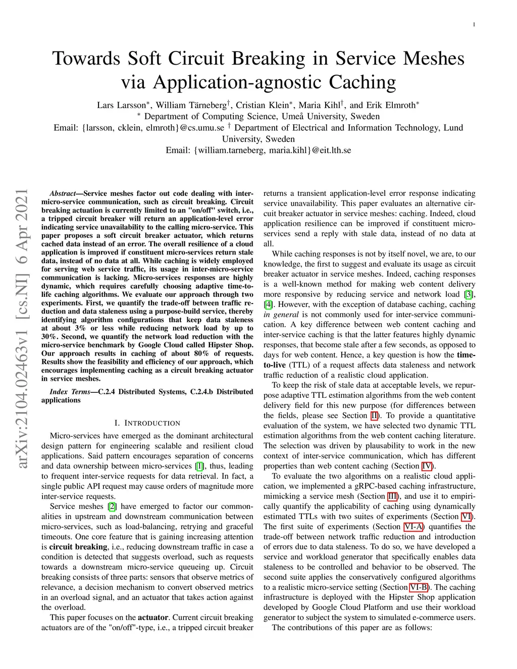 Service meshes factor out code dealing with inter-micro-service communication, such as circuit breaking. Circuit breaking actuation is currently limited to an "on/off" switch, i.e., a tripped circuit breaker will return an application-level error indicating service unavailability to the calling micro-service. This paper proposes a soft circuit breaker actuator, which returns cached data instead of an error. The overall resilience of a cloud application is improved if constituent micro-services return stale data, instead of no data at all. While caching is widely employed for serving web service traffic, its usage in inter-micro-service communication is lacking. Micro-services responses are highly dynamic, which requires carefully choosing adaptive time-to-life caching algorithms. We evaluate our approach through two experiments. First, we quantify the trade-off between traffic reduction and data staleness using a purpose-build service, thereby identifying algorithm configurations that keep data staleness at about 3% or less while reducing network load by up to 30%. Second, we quantify the network load reduction with the micro-service benchmark by Google Cloud called Hipster Shop. Our approach results in caching of about 80% of requests. Results show the feasibility and efficiency of our approach, which encourages implementing caching as a circuit breaking actuator in service meshes.