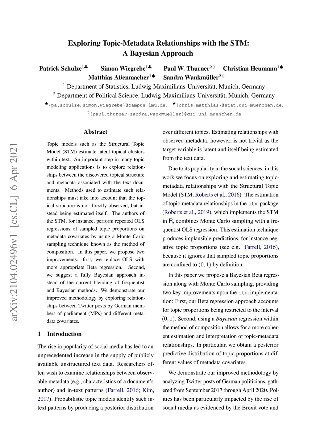The objective of advanced topic modeling is not only to explore latent topical structures, but also to estimate relationships between the discovered topics and theoretically relevant metadata. Methods used to estimate such relationships must take into account that the topical structure is not directly observed, but instead being estimated itself in an unsupervised fashion, usually by common topic models. A frequently used procedure to achieve this is the method of composition, a Monte Carlo sampling technique performing multiple repeated linear regressions of sampled topic proportions on metadata covariates. In this paper, we propose two modifications of this approach: First, we substantially refine the existing implementation of the method of composition from the R package stm by replacing linear regression with the more appropriate Beta regression. Second, we provide a fundamental enhancement of the entire estimation framework by substituting the current blending of frequentist and Bayesian methods with a fully Bayesian approach. This allows for a more appropriate quantification of uncertainty. We illustrate our improved methodology by investigating relationships between Twitter posts by German parliamentarians and different metadata covariates related to their electoral districts, using the Structural Topic Model to estimate topic proportions.