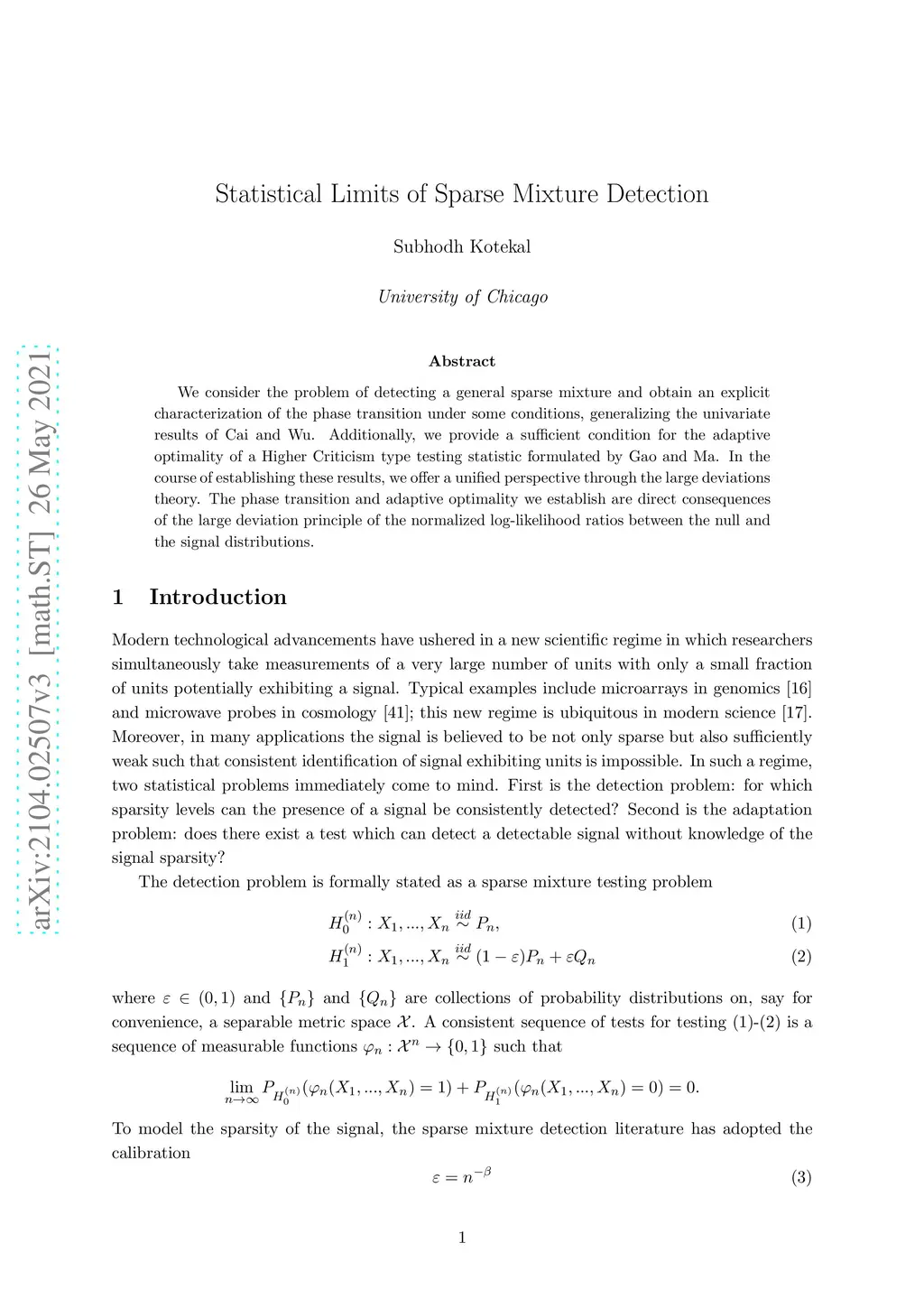 We consider the problem of detecting a general sparse mixture and obtain an explicit characterization of the phase transition under some conditions, generalizing the univariate results of Cai and Wu. Additionally, we provide a sufficient condition for the adaptive optimality of a Higher Criticism type testing statistic formulated by Gao and Ma. In the course of establishing these results, we offer a unified perspective through the large deviations theory. The phase transition and adaptive optimality we establish are direct consequences of the large deviation principle of the normalized log-likelihood ratios between the null and the signal distributions.