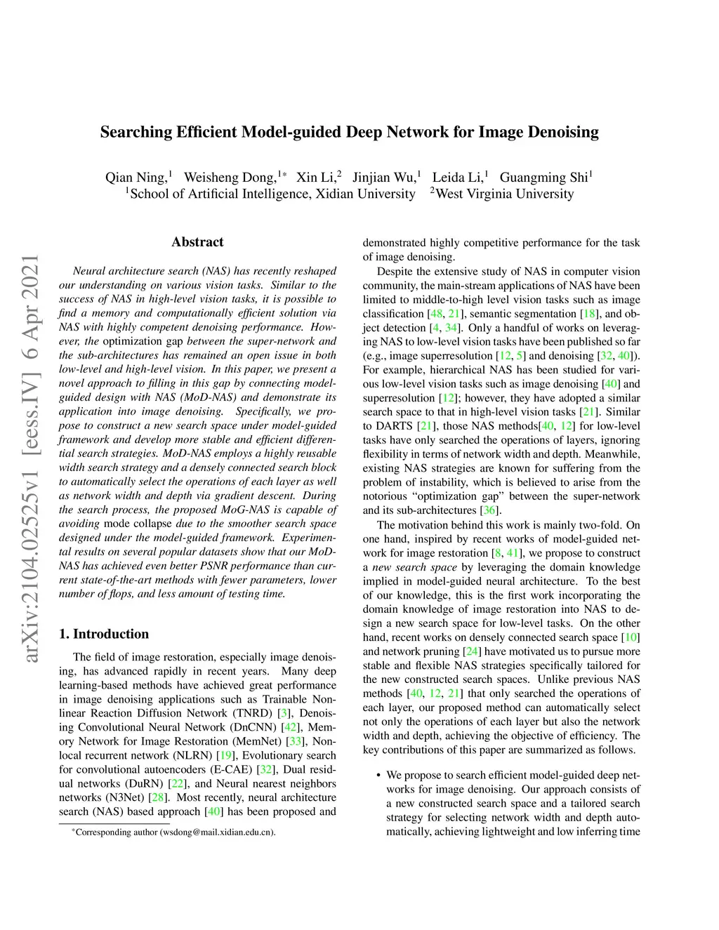 Neural architecture search (NAS) has recently reshaped our understanding on various vision tasks. Similar to the success of NAS in high-level vision tasks, it is possible to find a memory and computationally efficient solution via NAS with highly competent denoising performance. However, the optimization gap between the super-network and the sub-architectures has remained an open issue in both low-level and high-level vision. In this paper, we present a novel approach to filling in this gap by connecting model-guided design with NAS (MoD-NAS) and demonstrate its application into image denoising. Specifically, we propose to construct a new search space under model-guided framework and develop more stable and efficient differential search strategies. MoD-NAS employs a highly reusable width search strategy and a densely connected search block to automatically select the operations of each layer as well as network width and depth via gradient descent. During the search process, the proposed MoG-NAS is capable of avoiding mode collapse due to the smoother search space designed under the model-guided framework. Experimental results on several popular datasets show that our MoD-NAS has achieved even better PSNR performance than current state-of-the-art methods with fewer parameters, lower number of flops, and less amount of testing time.