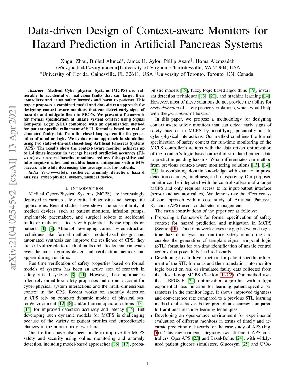 Medical Cyber-physical Systems (MCPS) are vulnerable to accidental or malicious faults that can target their controllers and cause safety hazards and harm to patients. This paper proposes a combined model and data-driven approach for designing context-aware monitors that can detect early signs of hazards and mitigate them in MCPS. We present a framework for formal specification of unsafe system context using Signal Temporal Logic (STL) combined with an optimization method for patient-specific refinement of STL formulas based on real or simulated faulty data from the closed-loop system for the generation of monitor logic. We evaluate our approach in simulation using two state-of-the-art closed-loop Artificial Pancreas Systems (APS). The results show the context-aware monitor achieves up to 1.4 times increase in average hazard prediction accuracy (F1-score) over several baseline monitors, reduces false-positive and false-negative rates, and enables hazard mitigation with a 54% success rate while decreasing the average risk for patients.
