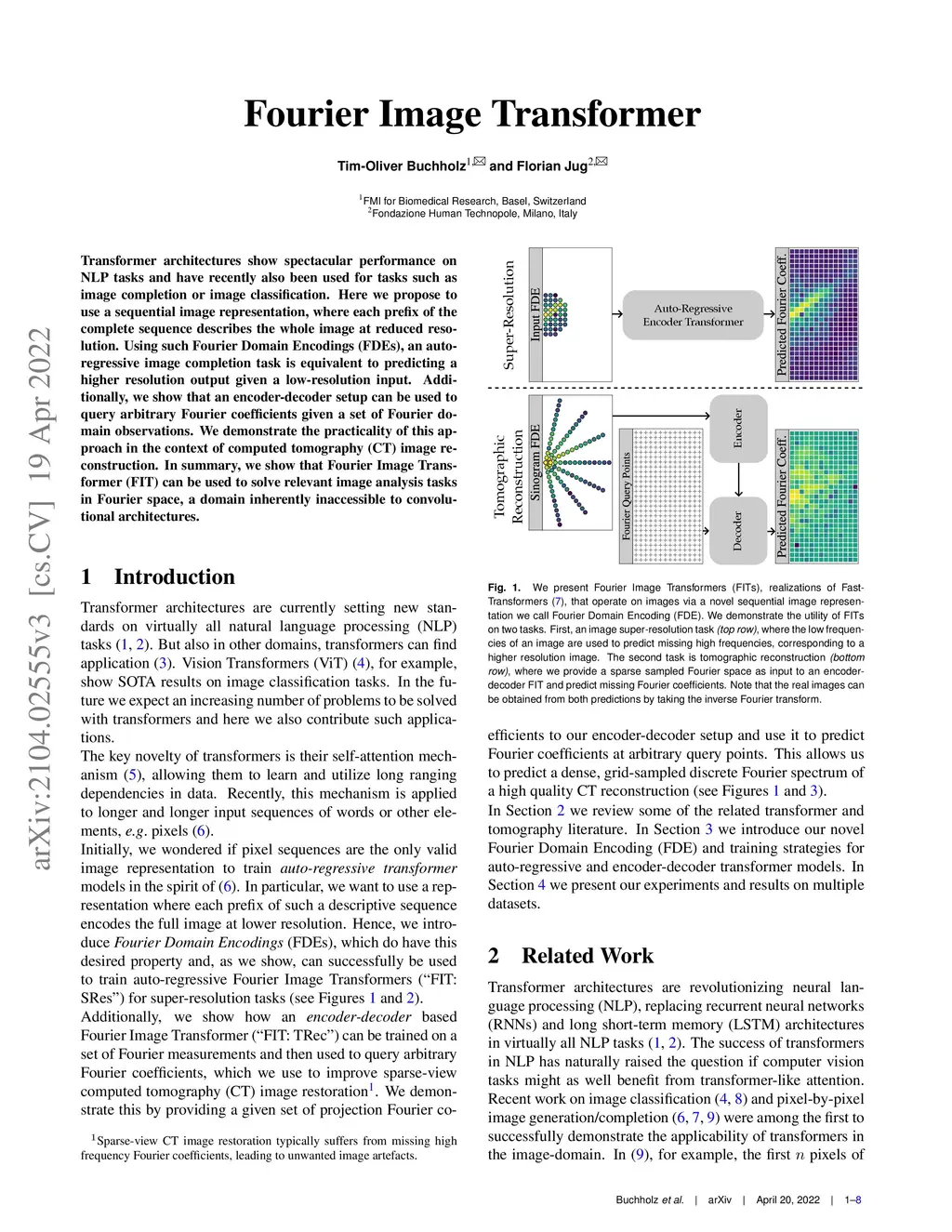 Transformer architectures show spectacular performance on NLP tasks and have recently also been used for tasks such as image completion or image classification. Here we propose to use a sequential image representation, where each prefix of the complete sequence describes the whole image at reduced resolution. Using such Fourier Domain Encodings (FDEs), an auto-regressive image completion task is equivalent to predicting a higher resolution output given a low-resolution input. Additionally, we show that an encoder-decoder setup can be used to query arbitrary Fourier coefficients given a set of Fourier domain observations. We demonstrate the practicality of this approach in the context of computed tomography (CT) image reconstruction. In summary, we show that Fourier Image Transformer (FIT) can be used to solve relevant image analysis tasks in Fourier space, a domain inherently inaccessible to convolutional architectures.