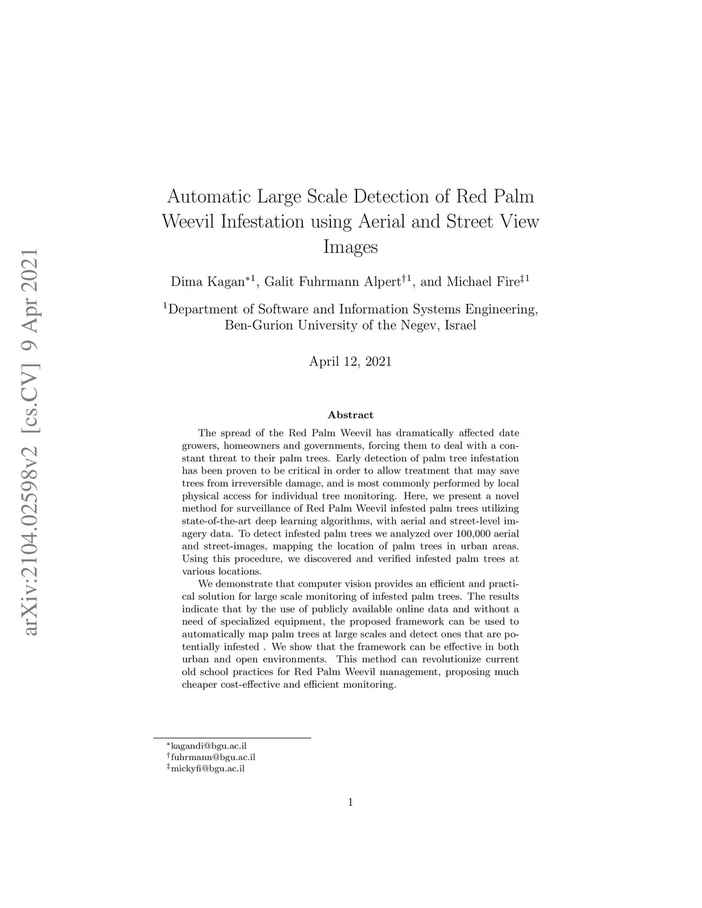 The spread of the Red Palm Weevil has dramatically affected date growers, homeowners and governments, forcing them to deal with a constant threat to their palm trees. Early detection of palm tree infestation has been proven to be critical in order to allow treatment that may save trees from irreversible damage, and is most commonly performed by local physical access for individual tree monitoring. Here, we present a novel method for surveillance of Red Palm Weevil infested palm trees utilizing state-of-the-art deep learning algorithms, with aerial and street-level imagery data. To detect infested palm trees we analyzed over 100,000 aerial and street-images, mapping the location of palm trees in urban areas. Using this procedure, we discovered and verified infested palm trees at various locations.