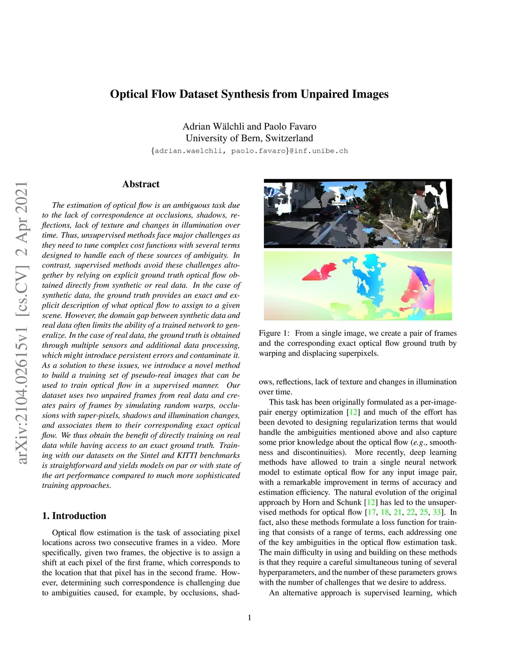 The estimation of optical flow is an ambiguous task due to the lack of correspondence at occlusions, shadows, reflections, lack of texture and changes in illumination over time. Thus, unsupervised methods face major challenges as they need to tune complex cost functions with several terms designed to handle each of these sources of ambiguity. In contrast, supervised methods avoid these challenges altogether by relying on explicit ground truth optical flow obtained directly from synthetic or real data. In the case of synthetic data, the ground truth provides an exact and explicit description of what optical flow to assign to a given scene. However, the domain gap between synthetic data and real data often limits the ability of a trained network to generalize. In the case of real data, the ground truth is obtained through multiple sensors and additional data processing, which might introduce persistent errors and contaminate it. As a solution to these issues, we introduce a novel method to build a training set of pseudo-real images that can be used to train optical flow in a supervised manner. Our dataset uses two unpaired frames from real data and creates pairs of frames by simulating random warps, occlusions with super-pixels, shadows and illumination changes, and associates them to their corresponding exact optical flow. We thus obtain the benefit of directly training on real data while having access to an exact ground truth. Training with our datasets on the Sintel and KITTI benchmarks is straightforward and yields models on par or with state of the art performance compared to much more sophisticated training approaches.