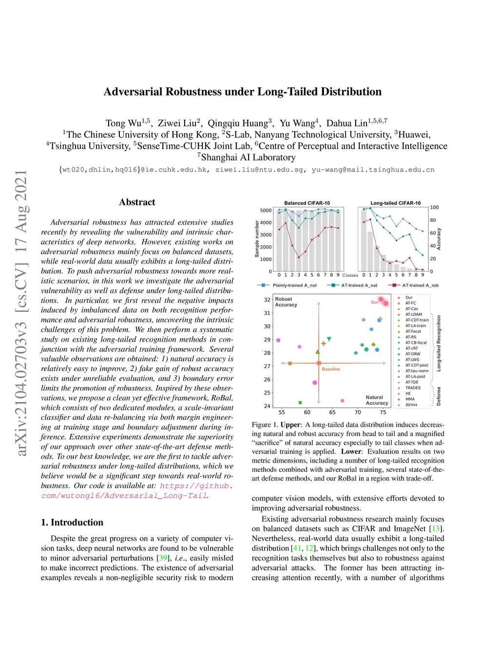 Adversarial robustness has attracted extensive studies recently by revealing the vulnerability and intrinsic characteristics of deep networks. However, existing works on adversarial robustness mainly focus on balanced datasets, while real-world data usually exhibits a long-tailed distribution. To push adversarial robustness towards more realistic scenarios, in this work we investigate the adversarial vulnerability as well as defense under long-tailed distributions. In particular, we first reveal the negative impacts induced by imbalanced data on both recognition performance and adversarial robustness, uncovering the intrinsic challenges of this problem. We then perform a systematic study on existing long-tailed recognition methods in conjunction with the adversarial training framework. Several valuable observations are obtained: 1) natural accuracy is relatively easy to improve, 2) fake gain of robust accuracy exists under unreliable evaluation, and 3) boundary error limits the promotion of robustness. Inspired by these observations, we propose a clean yet effective framework, RoBal, which consists of two dedicated modules, a scale-invariant classifier and data re-balancing via both margin engineering at training stage and boundary adjustment during inference. Extensive experiments demonstrate the superiority of our approach over other state-of-the-art defense methods. To our best knowledge, we are the first to tackle adversarial robustness under long-tailed distributions, which we believe would be a significant step towards real-world robustness. Our code is available at: https://github.com/wutong16/Adversarial_Long-Tail .