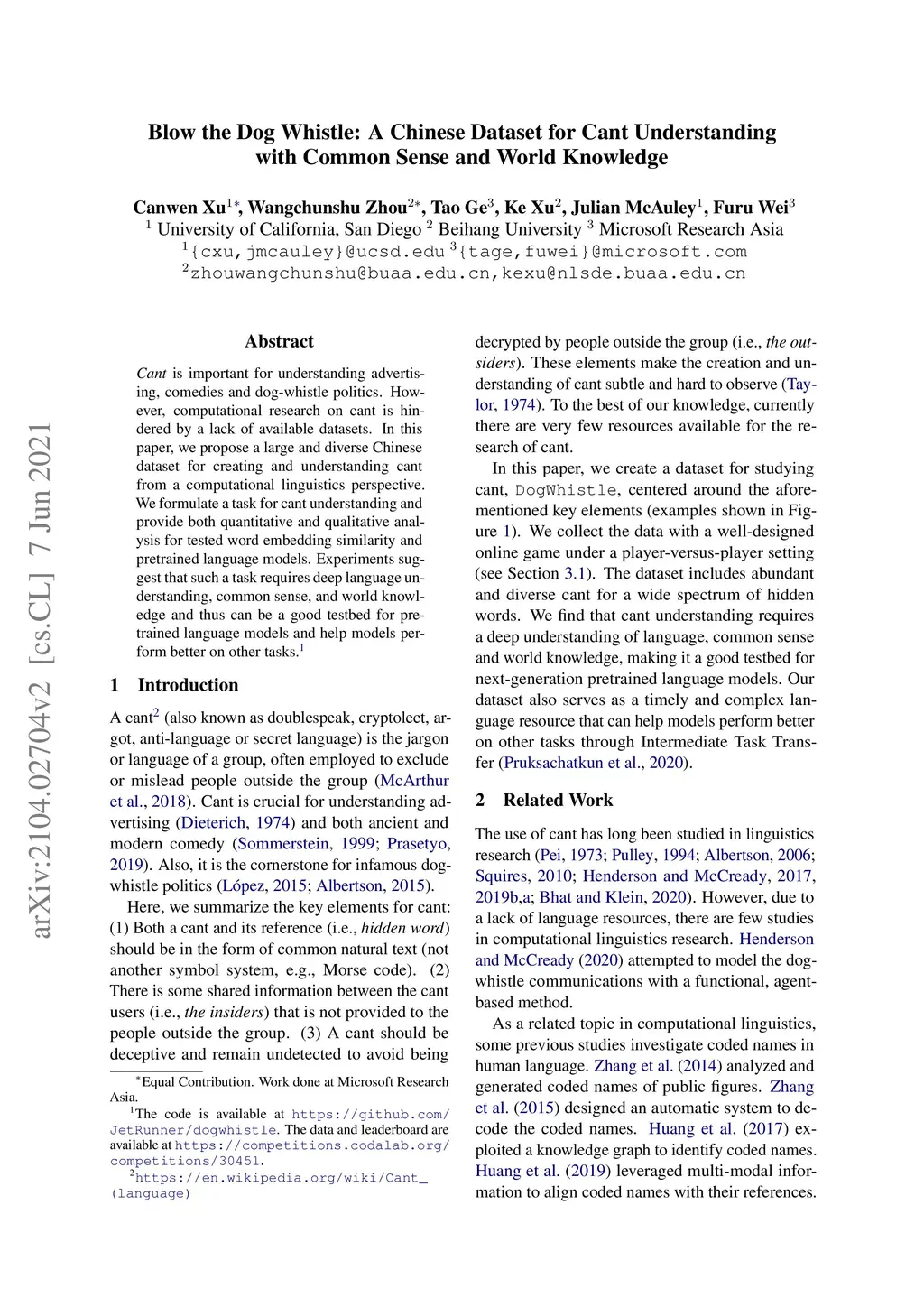 Cant is important for understanding advertising, comedies and dog-whistle politics. However, computational research on cant is hindered by a lack of available datasets. In this paper, we propose a large and diverse Chinese dataset for creating and understanding cant from a computational linguistics perspective. We formulate a task for cant understanding and provide both quantitative and qualitative analysis for tested word embedding similarity and pretrained language models. Experiments suggest that such a task requires deep language understanding, common sense, and world knowledge and thus can be a good testbed for pretrained language models and help models perform better on other tasks. The code is available at https://github.com/JetRunner/dogwhistle. The data and leaderboard are available at https://competitions.codalab.org/competitions/30451.