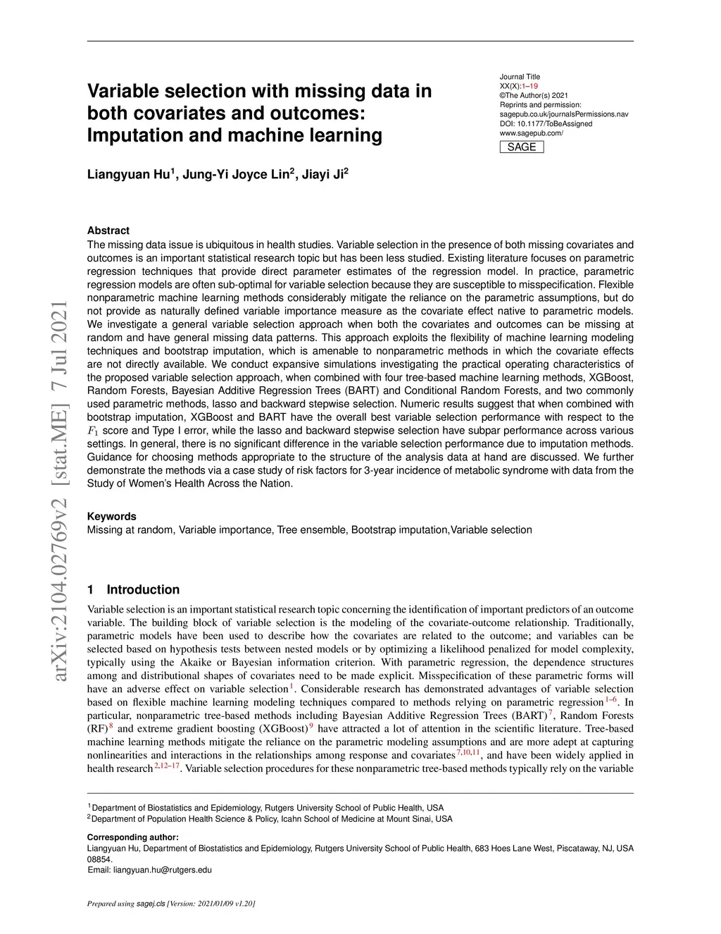 The missing data issue is ubiquitous in health studies. Variable selection in the presence of both missing covariates and outcomes is an important statistical research topic but has been less studied. Existing literature focuses on parametric regression techniques that provide direct parameter estimates of the regression model. Flexible nonparametric machine learning methods considerably mitigate the reliance on the parametric assumptions, but do not provide as naturally defined variable importance measure as the covariate effect native to parametric models. We investigate a general variable selection approach when both the covariates and outcomes can be missing at random and have general missing data patterns. This approach exploits the flexibility of machine learning modeling techniques and bootstrap imputation, which is amenable to nonparametric methods in which the covariate effects are not directly available. We conduct expansive simulations investigating the practical operating characteristics of the proposed variable selection approach, when combined with four tree-based machine learning methods, XGBoost, Random Forests, Bayesian Additive Regression Trees (BART) and Conditional Random Forests, and two commonly used parametric methods, lasso and backward stepwise selection. Numeric results suggest that when combined with bootstrap imputation, XGBoost and BART have the overall best variable selection performance with respect to the score and Type I error across various settings. In general, there is no significant difference in the variable selection performance due to imputation methods. We further demonstrate the methods via a case study of risk factors for 3-year incidence of metabolic syndrome with data from the Study of Women's Health Across the Nation.