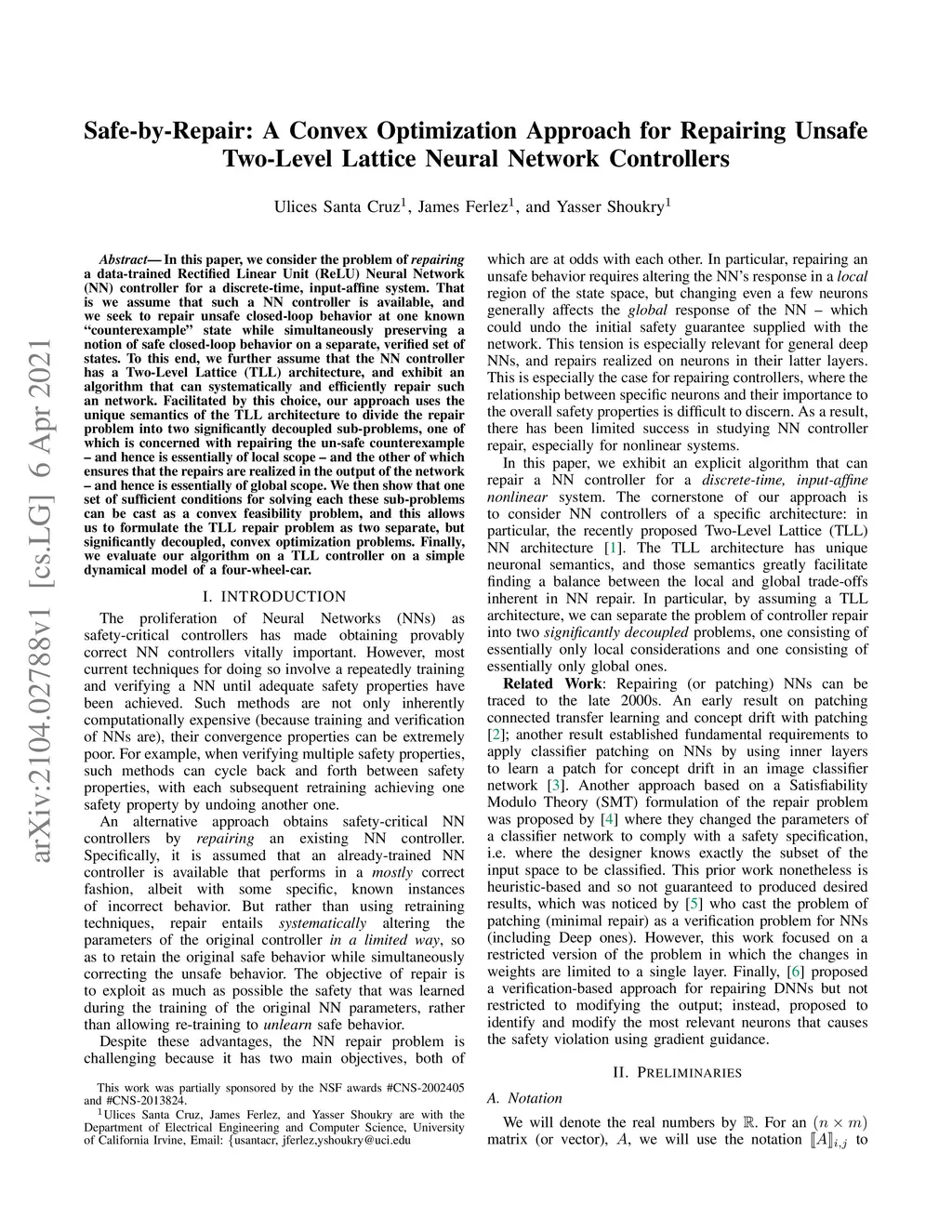 In this paper, we consider the problem of repairing a data-trained Rectified Linear Unit (ReLU) Neural Network (NN) controller for a discrete-time, input-affine system. That is we assume that such a NN controller is available, and we seek to repair unsafe closed-loop behavior at one known "counterexample" state while simultaneously preserving a notion of safe closed-loop behavior on a separate, verified set of states. To this end, we further assume that the NN controller has a Two-Level Lattice (TLL) architecture, and exhibit an algorithm that can systematically and efficiently repair such an network. Facilitated by this choice, our approach uses the unique semantics of the TLL architecture to divide the repair problem into two significantly decoupled sub-problems, one of which is concerned with repairing the un-safe counterexample -- and hence is essentially of local scope -- and the other of which ensures that the repairs are realized in the output of the network -- and hence is essentially of global scope. We then show that one set of sufficient conditions for solving each these sub-problems can be cast as a convex feasibility problem, and this allows us to formulate the TLL repair problem as two separate, but significantly decoupled, convex optimization problems. Finally, we evaluate our algorithm on a TLL controller on a simple dynamical model of a four-wheel-car.