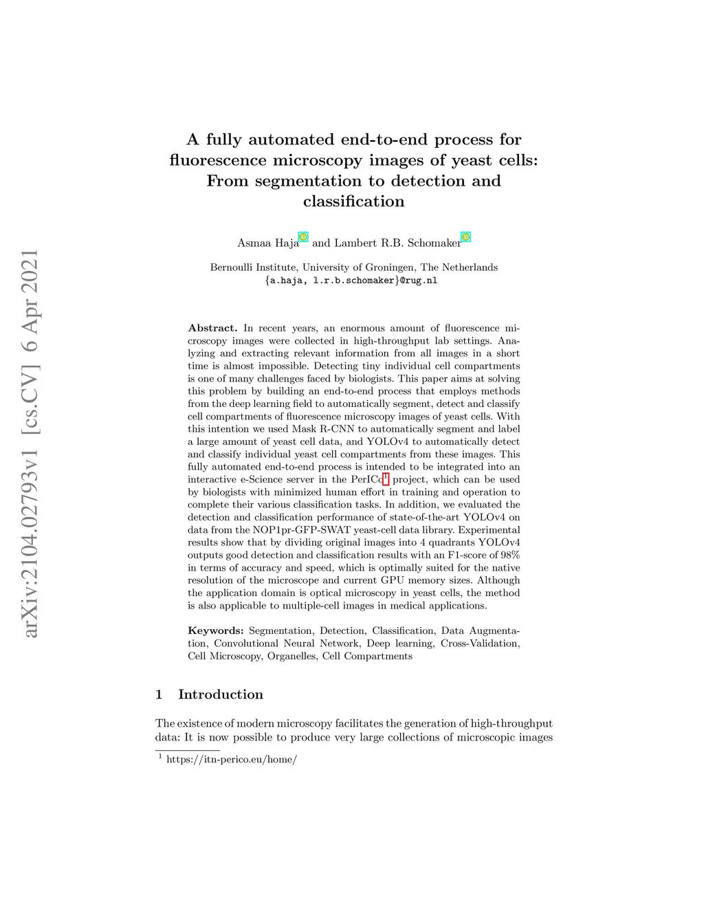 In recent years, an enormous amount of fluorescence microscopy images were collected in high-throughput lab settings. Analyzing and extracting relevant information from all images in a short time is almost impossible. Detecting tiny individual cell compartments is one of many challenges faced by biologists. This paper aims at solving this problem by building an end-to-end process that employs methods from the deep learning field to automatically segment, detect and classify cell compartments of fluorescence microscopy images of yeast cells. With this intention we used Mask R-CNN to automatically segment and label a large amount of yeast cell data, and YOLOv4 to automatically detect and classify individual yeast cell compartments from these images. This fully automated end-to-end process is intended to be integrated into an interactive e-Science server in the PerICo1 project, which can be used by biologists with minimized human effort in training and operation to complete their various classification tasks. In addition, we evaluated the detection and classification performance of state-of-the-art YOLOv4 on data from the NOP1pr-GFP-SWAT yeast-cell data library. Experimental results show that by dividing original images into 4 quadrants YOLOv4 outputs good detection and classification results with an F1-score of 98% in terms of accuracy and speed, which is optimally suited for the native resolution of the microscope and current GPU memory sizes. Although the application domain is optical microscopy in yeast cells, the method is also applicable to multiple-cell images in medical applications