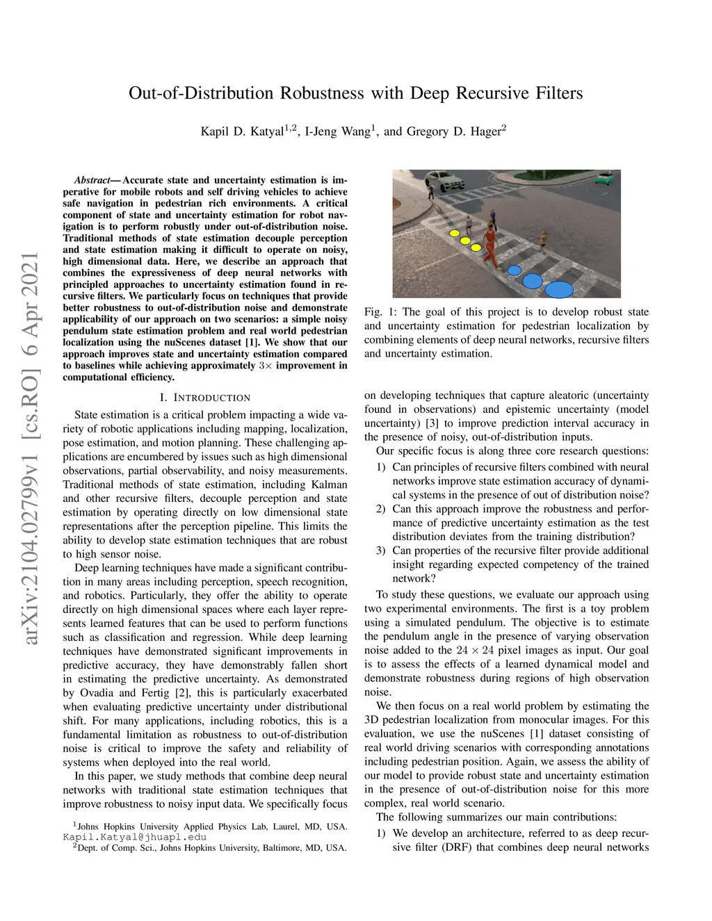 Accurate state and uncertainty estimation is imperative for mobile robots and self driving vehicles to achieve safe navigation in pedestrian rich environments. A critical component of state and uncertainty estimation for robot navigation is to perform robustly under out-of-distribution noise. Traditional methods of state estimation decouple perception and state estimation making it difficult to operate on noisy, high dimensional data. Here, we describe an approach that combines the expressiveness of deep neural networks with principled approaches to uncertainty estimation found in recursive filters. We particularly focus on techniques that provide better robustness to out-of-distribution noise and demonstrate applicability of our approach on two scenarios: a simple noisy pendulum state estimation problem and real world pedestrian localization using the nuScenes dataset. We show that our approach improves state and uncertainty estimation compared to baselines while achieving approximately 3x improvement in computational efficiency.