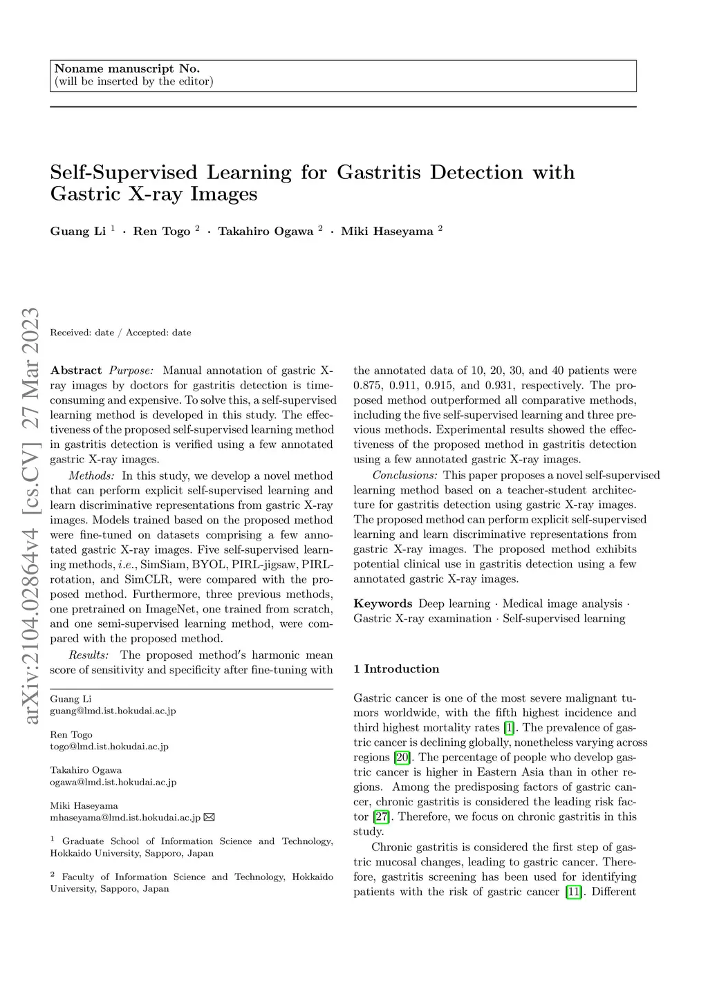 Self-Supervised Learning for Gastritis Detection with Gastric X-Ray