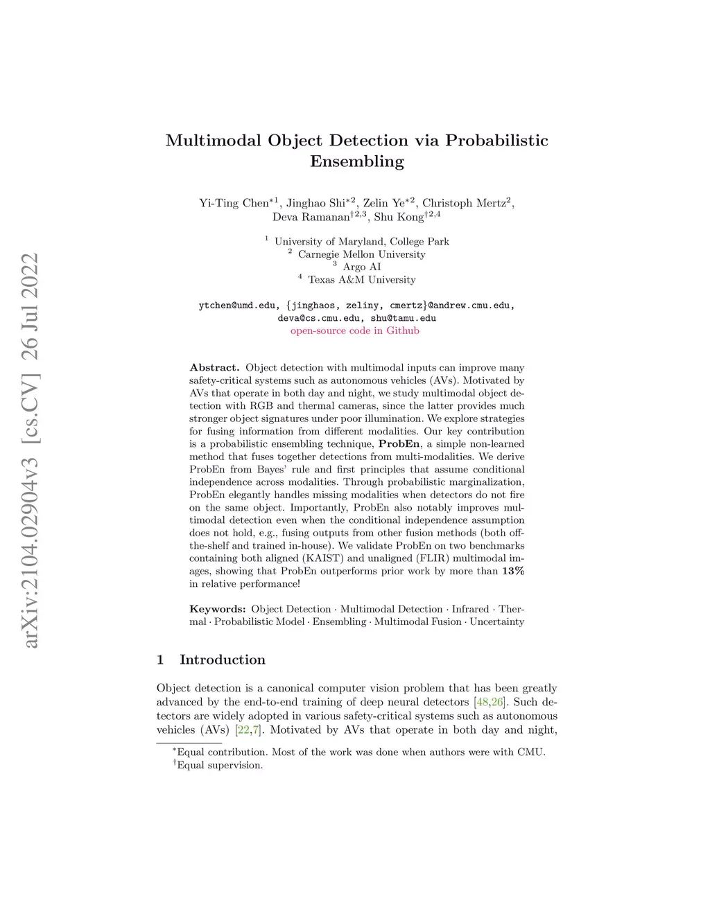 Object detection with multimodal inputs can improve many safety-critical systems such as autonomous vehicles (AVs). Motivated by AVs that operate in both day and night, we study multimodal object detection with RGB and thermal cameras, since the latter provides much stronger object signatures under poor illumination. We explore strategies for fusing information from different modalities. Our key contribution is a probabilistic ensembling technique, ProbEn, a simple non-learned method that fuses together detections from multi-modalities. We derive ProbEn from Bayes' rule and first principles that assume conditional independence across modalities. Through probabilistic marginalization, ProbEn elegantly handles missing modalities when detectors do not fire on the same object. Importantly, ProbEn also notably improves multimodal detection even when the conditional independence assumption does not hold, e.g., fusing outputs from other fusion methods (both off-the-shelf and trained in-house). We validate ProbEn on two benchmarks containing both aligned (KAIST) and unaligned (FLIR) multimodal images, showing that ProbEn outperforms prior work by more than 13% in relative performance!