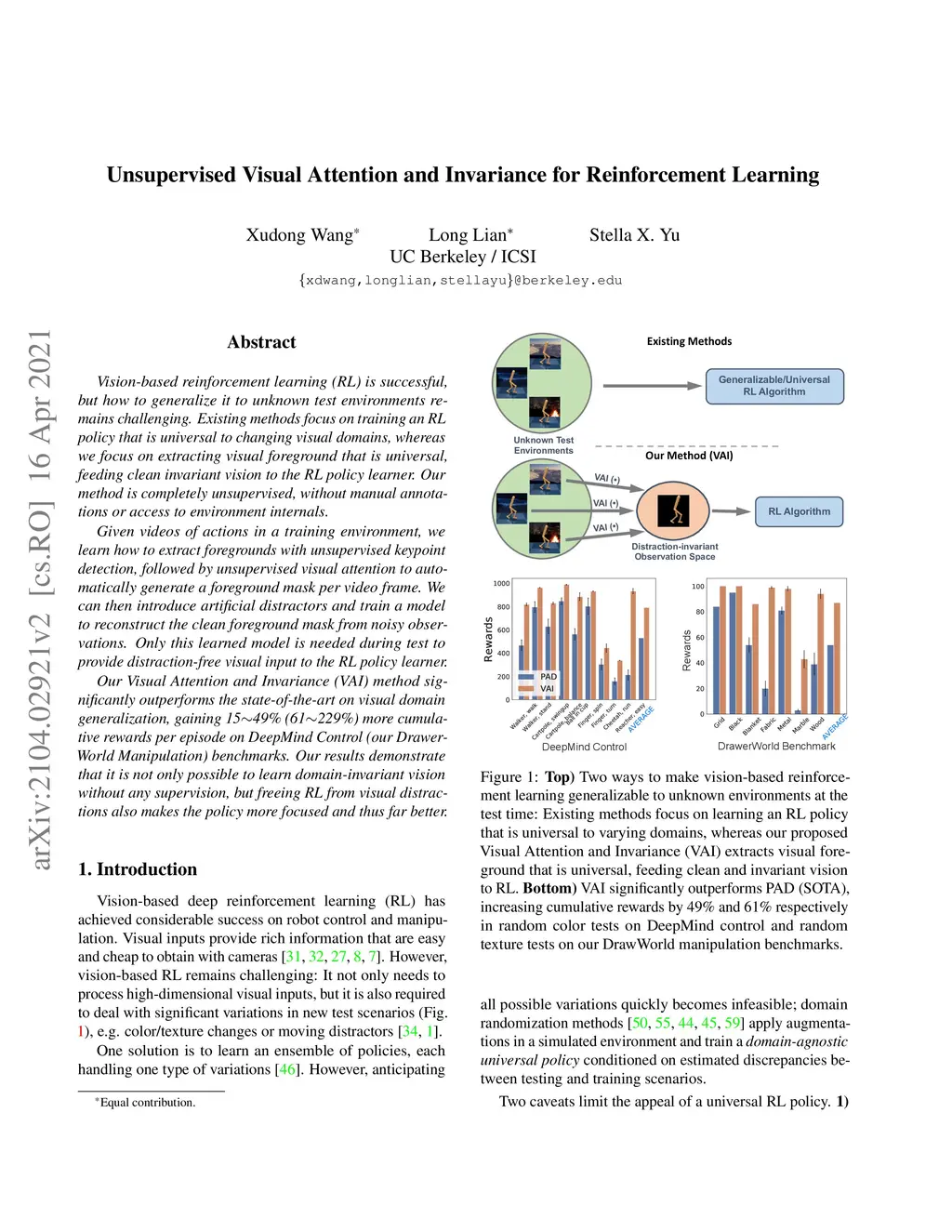 Vision-based reinforcement learning (RL) is successful, but how to generalize it to unknown test environments remains challenging. Existing methods focus on training an RL policy that is universal to changing visual domains, whereas we focus on extracting visual foreground that is universal, feeding clean invariant vision to the RL policy learner. Our method is completely unsupervised, without manual annotations or access to environment internals. Given videos of actions in a training environment, we learn how to extract foregrounds with unsupervised keypoint detection, followed by unsupervised visual attention to automatically generate a foreground mask per video frame. We can then introduce artificial distractors and train a model to reconstruct the clean foreground mask from noisy observations. Only this learned model is needed during test to provide distraction-free visual input to the RL policy learner. Our Visual Attention and Invariance (VAI) method significantly outperforms the state-of-the-art on visual domain generalization, gaining 15 to 49% (61 to 229%) more cumulative rewards per episode on DeepMind Control (our DrawerWorld Manipulation) benchmarks. Our results demonstrate that it is not only possible to learn domain-invariant vision without any supervision, but freeing RL from visual distractions also makes the policy more focused and thus far better.