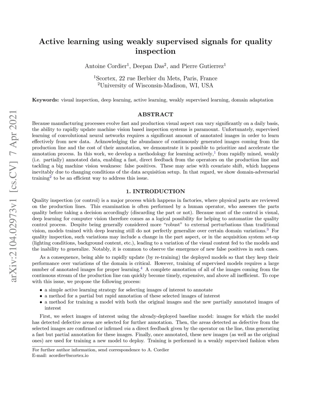 Because manufacturing processes evolve fast, and since production visual aspect can vary significantly on a daily basis, the ability to rapidly update machine vision based inspection systems is paramount. Unfortunately, supervised learning of convolutional neural networks requires a significant amount of annotated images for being able to learn effectively from new data. Acknowledging the abundance of continuously generated images coming from the production line and the cost of their annotation, we demonstrate it is possible to prioritize and accelerate the annotation process. In this work, we develop a methodology for learning actively, from rapidly mined, weakly (i.e. partially) annotated data, enabling a fast, direct feedback from the operators on the production line and tackling a big machine vision weakness: false positives. We also consider the problem of covariate shift, which arises inevitably due to changing conditions during data acquisition. In that regard, we show domain-adversarial training to be an efficient way to address this issue.