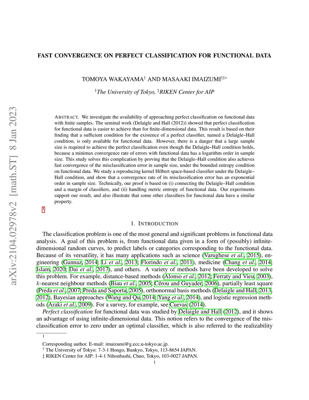 We investigate the availability of approaching perfect classification on functional data with finite samples. The seminal work (Delaigle and Hall (2012)) showed that perfect classification for functional data is easier to achieve than for finite-dimensional data. This result is based on their finding that a sufficient condition for the existence of a perfect classifier, named a Delaigle--Hall condition, is only available for functional data. However, there is a danger that a large sample size is required to achieve the perfect classification even though the Delaigle--Hall condition holds, because a minimax convergence rate of errors with functional data has a logarithm order in sample size. This study solves this complication by proving that the Delaigle--Hall condition also achieves fast convergence of the misclassification error in sample size, under the bounded entropy condition on functional data. We study a reproducing kernel Hilbert space-based classifier under the Delaigle--Hall condition, and show that a convergence rate of its misclassification error has an exponential order in sample size. Technically, our proof is based on (i) connecting the Delaigle--Hall condition and a margin of classifiers, and (ii) handling metric entropy of functional data. Our experiments support our result, and also illustrate that some other classifiers for functional data have a similar property.