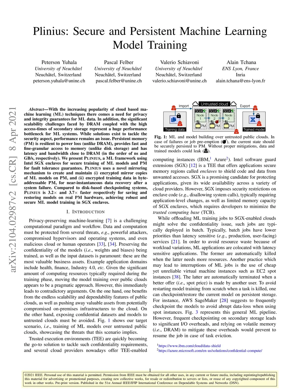 With the increasing popularity of cloud based machine learning (ML) techniques there comes a need for privacy and integrity guarantees for ML data. In addition, the significant scalability challenges faced by DRAM coupled with the high access-times of secondary storage represent a huge performance bottleneck for ML systems. While solutions exist to tackle the security aspect, performance remains an issue. Persistent memory (PM) is resilient to power loss (unlike DRAM), provides fast and fine-granular access to memory (unlike disk storage) and has latency and bandwidth close to DRAM (in the order of ns and GB/s, respectively). We present PLINIUS, a ML framework using Intel SGX enclaves for secure training of ML models and PM for fault tolerance guarantees. PLINIUS uses a novel mirroring mechanism to create and maintain (i) encrypted mirror copies of ML models on PM, and (ii) encrypted training data in byte-addressable PM, for near-instantaneous data recovery after a system failure. Compared to disk-based checkpointing systems, PLINIUS is 3.2x and 3.7x faster respectively for saving and restoring models on real PM hardware, achieving robust and secure ML model training in SGX enclaves.