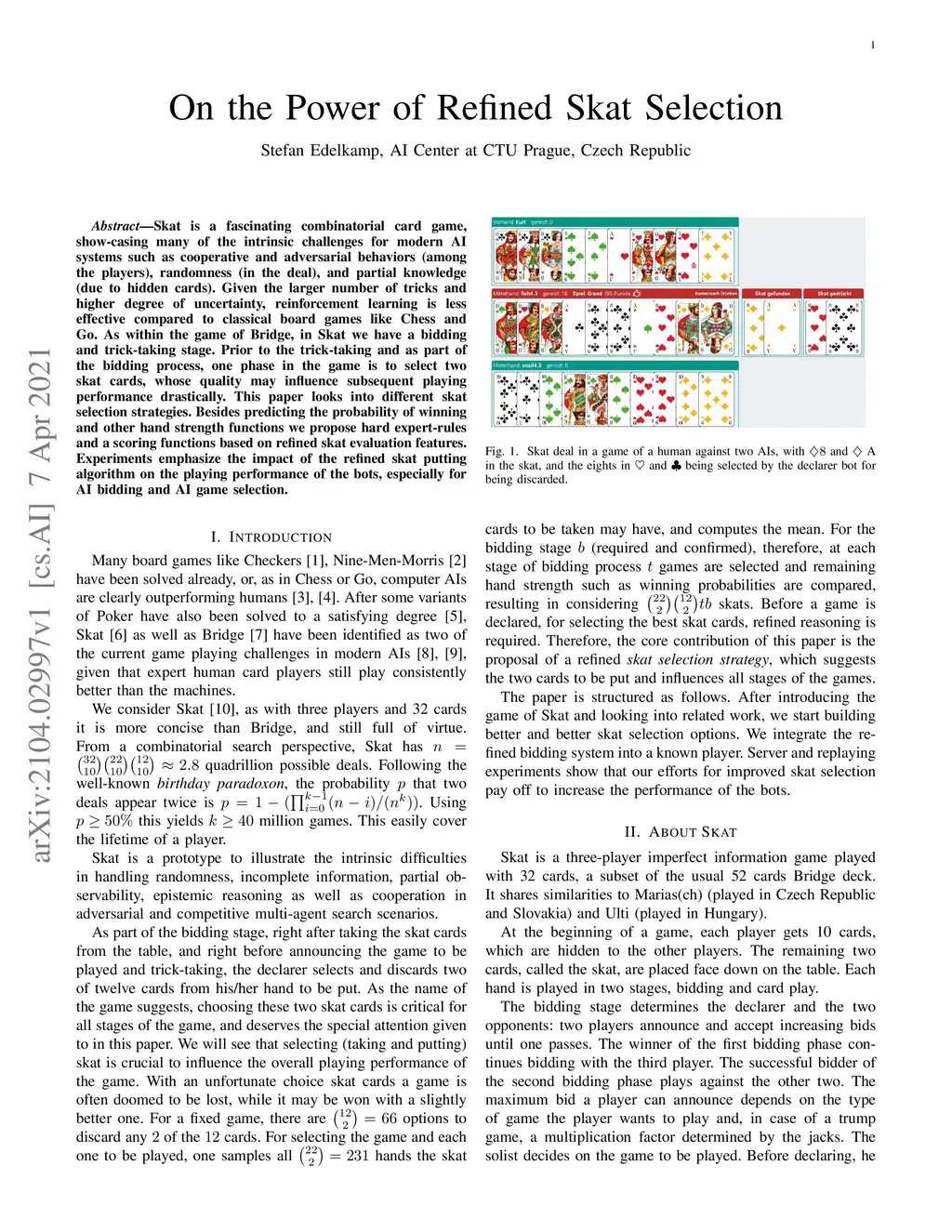 Skat is a fascinating combinatorial card game, show-casing many of the intrinsic challenges for modern AI systems such as cooperative and adversarial behaviors (among the players), randomness (in the deal), and partial knowledge (due to hidden cards). Given the larger number of tricks and higher degree of uncertainty, reinforcement learning is less effective compared to classical board games like Chess and Go. As within the game of Bridge, in Skat we have a bidding and trick-taking stage. Prior to the trick-taking and as part of the bidding process, one phase in the game is to select two skat cards, whose quality may influence subsequent playing performance drastically. This paper looks into different skat selection strategies. Besides predicting the probability of winning and other hand strength functions we propose hard expert-rules and a scoring functions based on refined skat evaluation features. Experiments emphasize the impact of the refined skat putting algorithm on the playing performance of the bots, especially for AI bidding and AI game selection.