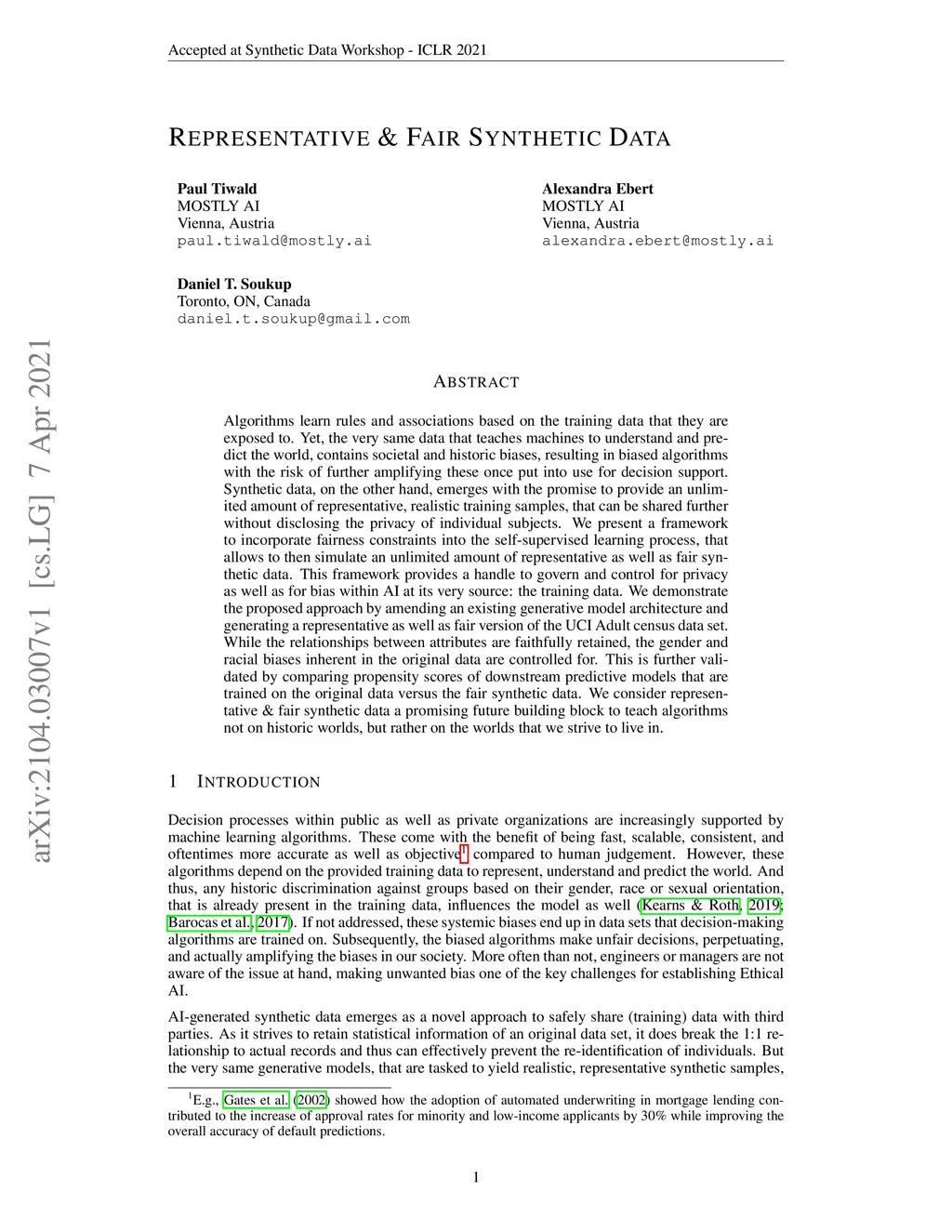 Algorithms learn rules and associations based on the training data that they are exposed to. Yet, the very same data that teaches machines to understand and predict the world, contains societal and historic biases, resulting in biased algorithms with the risk of further amplifying these once put into use for decision support. Synthetic data, on the other hand, emerges with the promise to provide an unlimited amount of representative, realistic training samples, that can be shared further without disclosing the privacy of individual subjects. We present a framework to incorporate fairness constraints into the self-supervised learning process, that allows to then simulate an unlimited amount of representative as well as fair synthetic data. This framework provides a handle to govern and control for privacy as well as for bias within AI at its very source: the training data. We demonstrate the proposed approach by amending an existing generative model architecture and generating a representative as well as fair version of the UCI Adult census data set. While the relationships between attributes are faithfully retained, the gender and racial biases inherent in the original data are controlled for. This is further validated by comparing propensity scores of downstream predictive models that are trained on the original data versus the fair synthetic data. We consider representative & fair synthetic data a promising future building block to teach algorithms not on historic worlds, but rather on the worlds that we strive to live in.