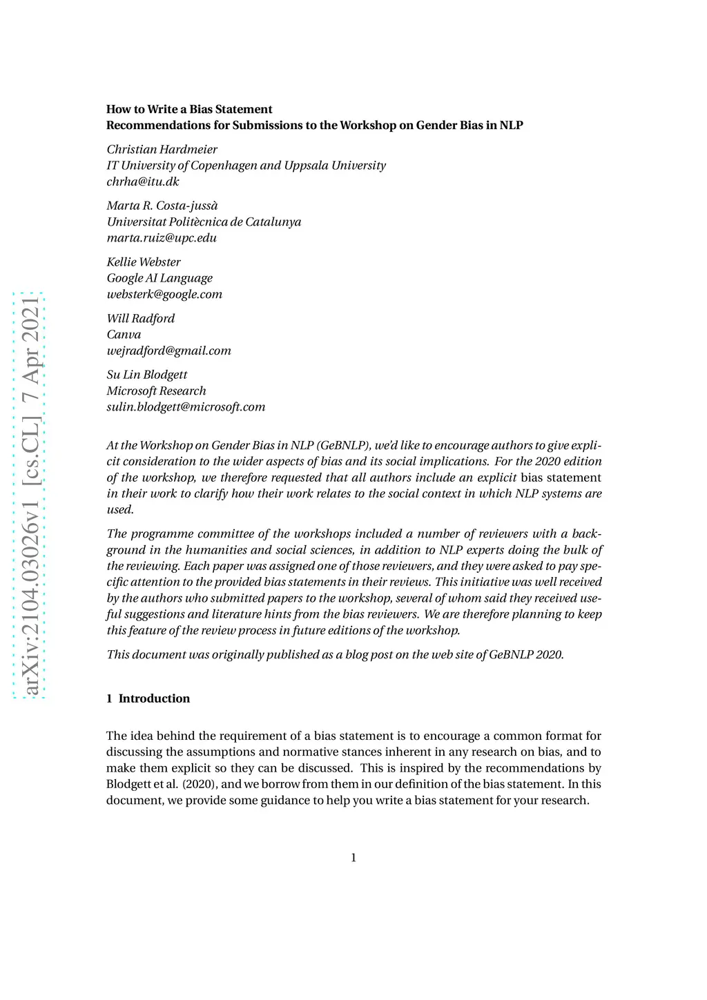 At the Workshop on Gender Bias in NLP (GeBNLP), we'd like to encourage authors to give explicit consideration to the wider aspects of bias and its social implications. For the 2020 edition of the workshop, we therefore requested that all authors include an explicit bias statement in their work to clarify how their work relates to the social context in which NLP systems are used. The programme committee of the workshops included a number of reviewers with a background in the humanities and social sciences, in addition to NLP experts doing the bulk of the reviewing. Each paper was assigned one of those reviewers, and they were asked to pay specific attention to the provided bias statements in their reviews. This initiative was well received by the authors who submitted papers to the workshop, several of whom said they received useful suggestions and literature hints from the bias reviewers. We are therefore planning to keep this feature of the review process in future editions of the workshop.