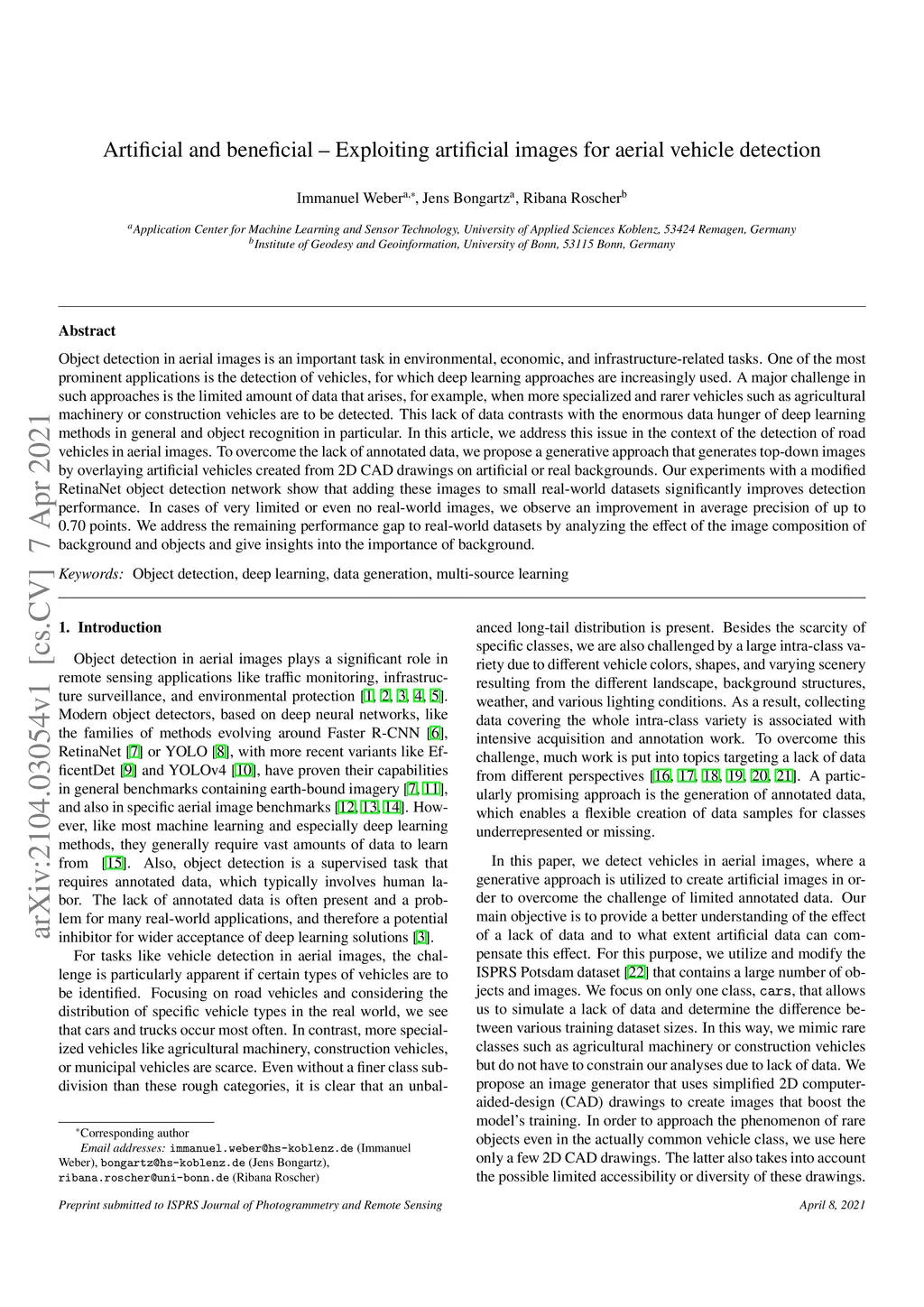 Object detection in aerial images is an important task in environmental, economic, and infrastructure-related tasks. One of the most prominent applications is the detection of vehicles, for which deep learning approaches are increasingly used. A major challenge in such approaches is the limited amount of data that arises, for example, when more specialized and rarer vehicles such as agricultural machinery or construction vehicles are to be detected. This lack of data contrasts with the enormous data hunger of deep learning methods in general and object recognition in particular. In this article, we address this issue in the context of the detection of road vehicles in aerial images. To overcome the lack of annotated data, we propose a generative approach that generates top-down images by overlaying artificial vehicles created from 2D CAD drawings on artificial or real backgrounds. Our experiments with a modified RetinaNet object detection network show that adding these images to small real-world datasets significantly improves detection performance. In cases of very limited or even no real-world images, we observe an improvement in average precision of up to 0.70 points. We address the remaining performance gap to real-world datasets by analyzing the effect of the image composition of background and objects and give insights into the importance of background.