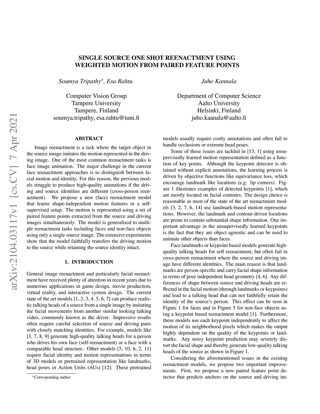 Single Source One Shot Reenactment using Weighted motion From Paired