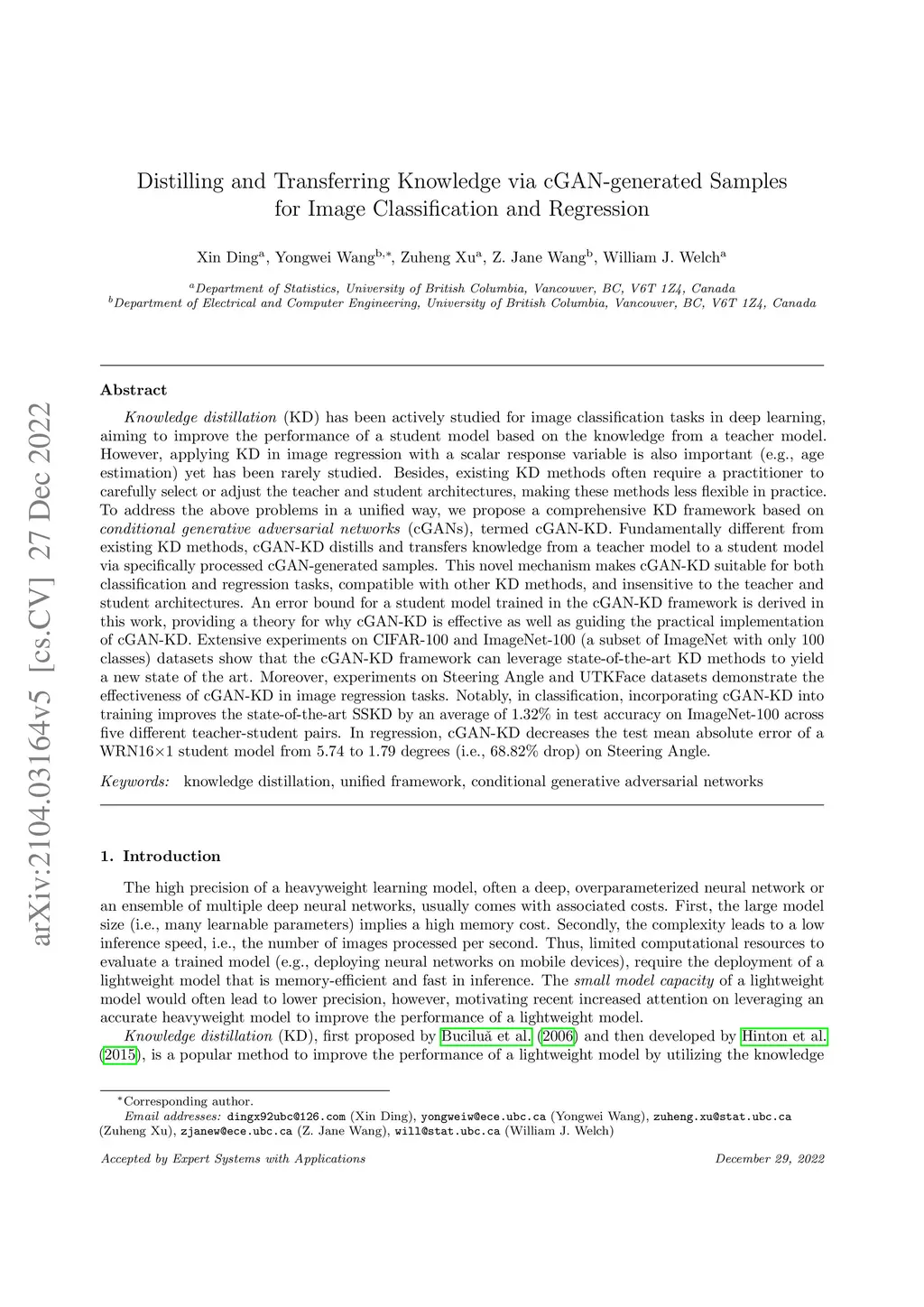Knowledge distillation (KD) has been actively studied for image classification tasks in deep learning, aiming to improve the performance of a student based on the knowledge from a teacher. However, applying KD in image regression with a scalar response variable has been rarely studied, and there exists no KD method applicable to both classification and regression tasks yet. Moreover, existing KD methods often require a practitioner to carefully select or adjust the teacher and student architectures, making these methods less flexible in practice. To address the above problems in a unified way, we propose a comprehensive KD framework based on cGANs, termed cGAN-KD. Fundamentally different from existing KD methods, cGAN-KD distills and transfers knowledge from a teacher model to a student model via cGAN-generated samples. This novel mechanism makes cGAN-KD suitable for both classification and regression tasks, compatible with other KD methods, and insensitive to the teacher and student architectures. An error bound for a student model trained in the cGAN-KD framework is derived in this work, providing a theory for why cGAN-KD is effective as well as guiding the practical implementation of cGAN-KD. Extensive experiments on CIFAR-100 and ImageNet-100 show that we can combine state of the art KD methods with the cGAN-KD framework to yield a new state of the art. Moreover, experiments on Steering Angle and UTKFace demonstrate the effectiveness of cGAN-KD in image regression tasks, where existing KD methods are inapplicable.