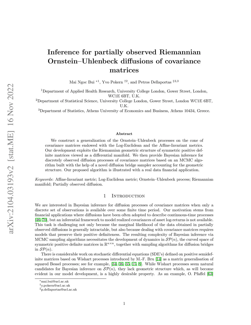 We construct a generalization of the Ornstein--Uhlenbeck processes on the cone of covariance matrices endowed with the Log-Euclidean and the Affine-Invariant metrics. Our development exploits the Riemannian geometric structure of symmetric positive definite matrices viewed as a differential manifold. We then provide Bayesian inference for discretely observed diffusion processes of covariance matrices based on an MCMC algorithm built with the help of a novel diffusion bridge sampler accounting for the geometric structure. Our proposed algorithm is illustrated with a real data financial application.