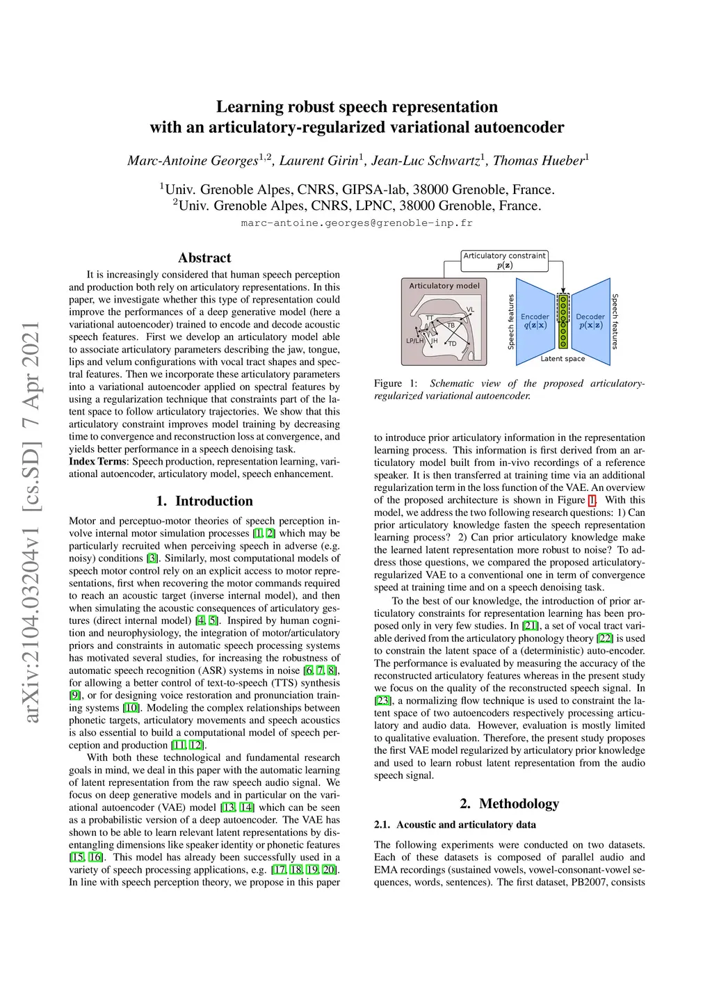 It is increasingly considered that human speech perception and production both rely on articulatory representations. In this paper, we investigate whether this type of representation could improve the performances of a deep generative model (here a variational autoencoder) trained to encode and decode acoustic speech features. First we develop an articulatory model able to associate articulatory parameters describing the jaw, tongue, lips and velum configurations with vocal tract shapes and spectral features. Then we incorporate these articulatory parameters into a variational autoencoder applied on spectral features by using a regularization technique that constraints part of the latent space to follow articulatory trajectories. We show that this articulatory constraint improves model training by decreasing time to convergence and reconstruction loss at convergence, and yields better performance in a speech denoising task.