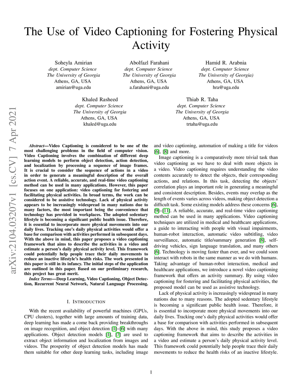 Video Captioning is considered to be one of the most challenging problems in the field of computer vision. Video Captioning involves the combination of different deep learning models to perform object detection, action detection, and localization by processing a sequence of image frames. It is crucial to consider the sequence of actions in a video in order to generate a meaningful description of the overall action event. A reliable, accurate, and real-time video captioning method can be used in many applications. However, this paper focuses on one application: video captioning for fostering and facilitating physical activities. In broad terms, the work can be considered to be assistive technology. Lack of physical activity appears to be increasingly widespread in many nations due to many factors, the most important being the convenience that technology has provided in workplaces. The adopted sedentary lifestyle is becoming a significant public health issue. Therefore, it is essential to incorporate more physical movements into our daily lives. Tracking one's daily physical activities would offer a base for comparison with activities performed in subsequent days. With the above in mind, this paper proposes a video captioning framework that aims to describe the activities in a video and estimate a person's daily physical activity level. This framework could potentially help people trace their daily movements to reduce an inactive lifestyle's health risks. The work presented in this paper is still in its infancy. The initial steps of the application are outlined in this paper. Based on our preliminary research, this project has great merit.