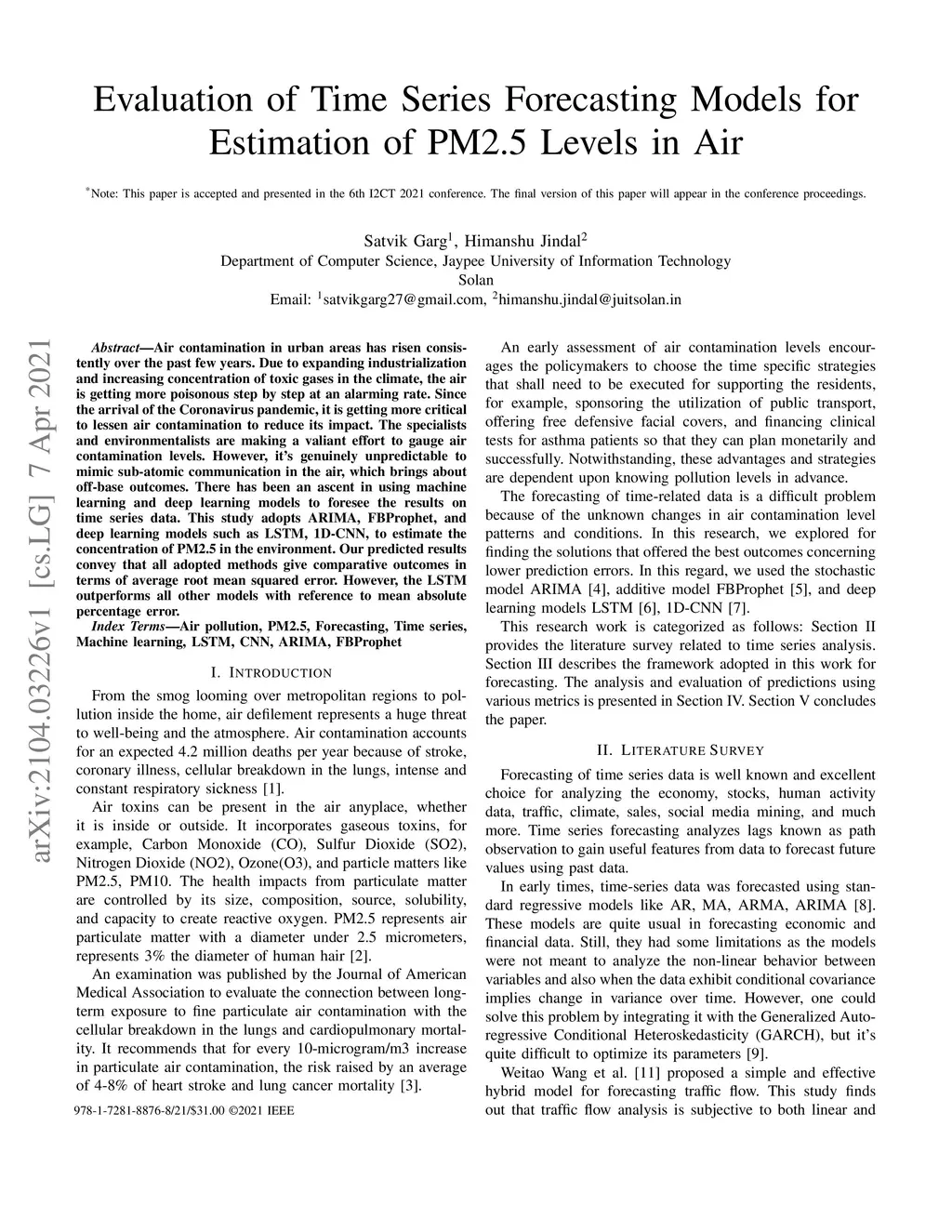 Air contamination in urban areas has risen consistently over the past few years. Due to expanding industrialization and increasing concentration of toxic gases in the climate, the air is getting more poisonous step by step at an alarming rate. Since the arrival of the Coronavirus pandemic, it is getting more critical to lessen air contamination to reduce its impact. The specialists and environmentalists are making a valiant effort to gauge air contamination levels. However, its genuinely unpredictable to mimic subatomic communication in the air, which brings about off base outcomes. There has been an ascent in using machine learning and deep learning models to foresee the results on time series data. This study adopts ARIMA, FBProphet, and deep learning models such as LSTM, 1D CNN, to estimate the concentration of PM2.5 in the environment. Our predicted results convey that all adopted methods give comparative outcomes in terms of average root mean squared error. However, the LSTM outperforms all other models with reference to mean absolute percentage error.