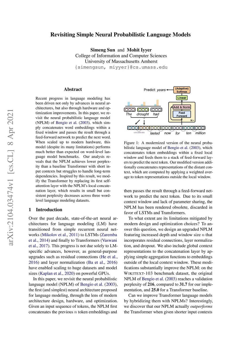 Recent progress in language modeling has been driven not only by advances in neural architectures, but also through hardware and optimization improvements. In this paper, we revisit the neural probabilistic language model (NPLM) of~\citet{Bengio2003ANP}, which simply concatenates word embeddings within a fixed window and passes the result through a feed-forward network to predict the next word. When scaled up to modern hardware, this model (despite its many limitations) performs much better than expected on word-level language model benchmarks. Our analysis reveals that the NPLM achieves lower perplexity than a baseline Transformer with short input contexts but struggles to handle long-term dependencies. Inspired by this result, we modify the Transformer by replacing its first self-attention layer with the NPLM's local concatenation layer, which results in small but consistent perplexity decreases across three word-level language modeling datasets.