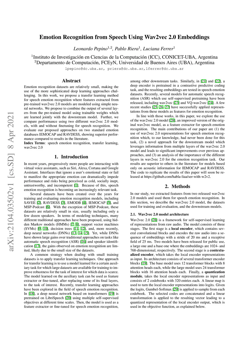 Emotion Recognition from Speech Using Wav2vec 2.0 Embeddings