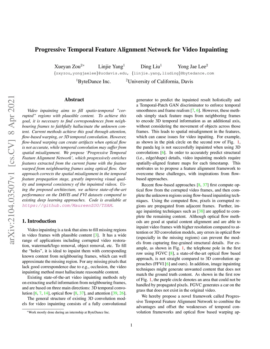 Progressive Temporal Feature Alignment Network for Video Inpainting