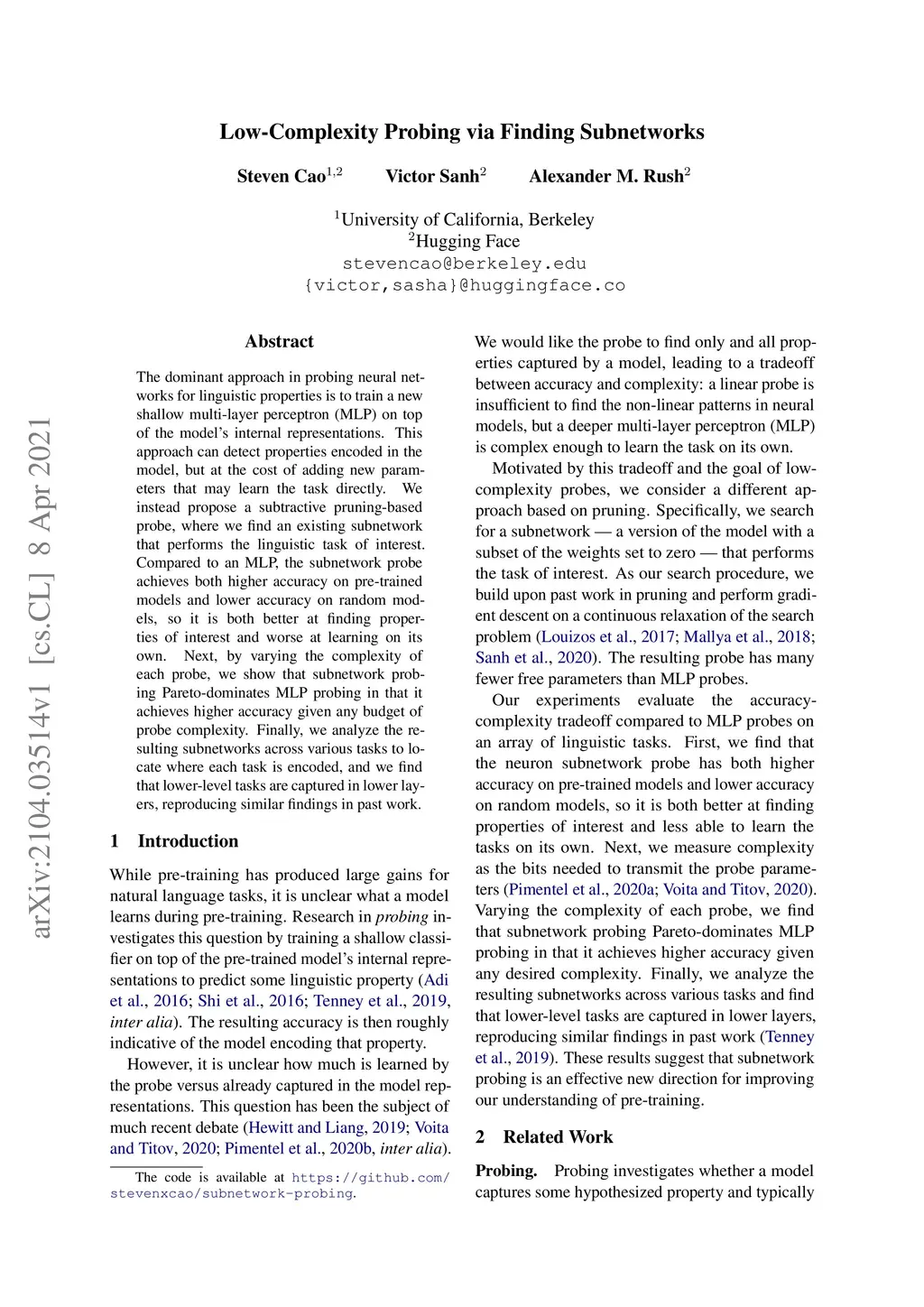 The dominant approach in probing neural networks for linguistic properties is to train a new shallow multi-layer perceptron (MLP) on top of the model's internal representations. This approach can detect properties encoded in the model, but at the cost of adding new parameters that may learn the task directly. We instead propose a subtractive pruning-based probe, where we find an existing subnetwork that performs the linguistic task of interest. Compared to an MLP, the subnetwork probe achieves both higher accuracy on pre-trained models and lower accuracy on random models, so it is both better at finding properties of interest and worse at learning on its own. Next, by varying the complexity of each probe, we show that subnetwork probing Pareto-dominates MLP probing in that it achieves higher accuracy given any budget of probe complexity. Finally, we analyze the resulting subnetworks across various tasks to locate where each task is encoded, and we find that lower-level tasks are captured in lower layers, reproducing similar findings in past work.