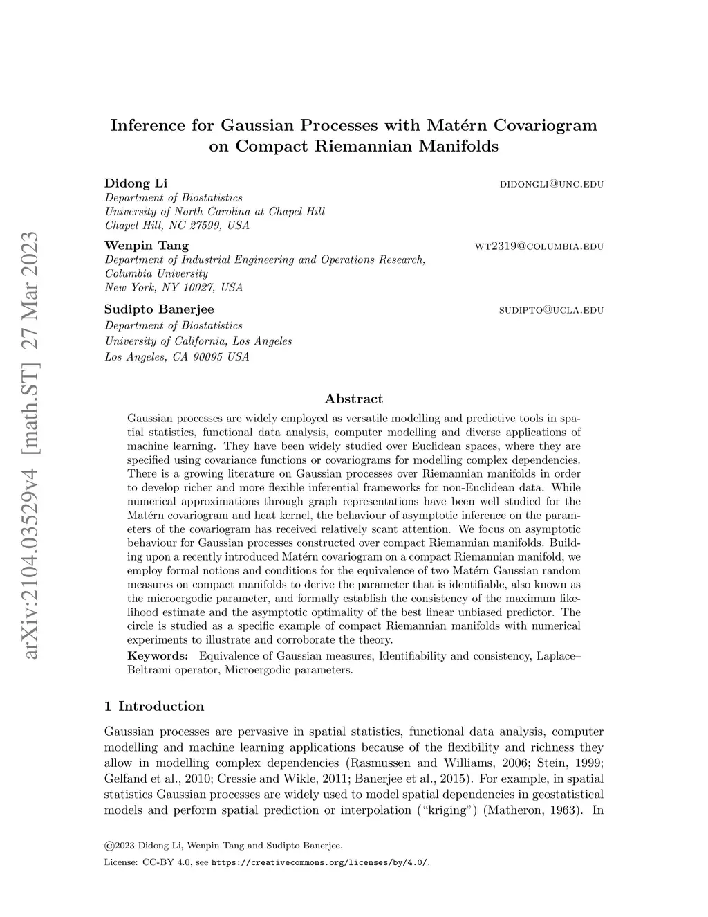 Inference for Gaussian Processes with Matérn Covariogram on Compact