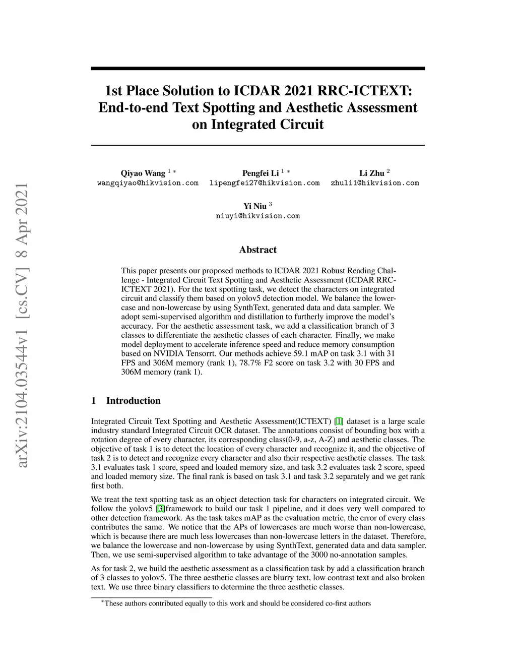 This paper presents our proposed methods to ICDAR 2021 Robust Reading Challenge - Integrated Circuit Text Spotting and Aesthetic Assessment (ICDAR RRC-ICTEXT 2021). For the text spotting task, we detect the characters on integrated circuit and classify them based on yolov5 detection model. We balance the lowercase and non-lowercase by using SynthText, generated data and data sampler. We adopt semi-supervised algorithm and distillation to furtherly improve the model's accuracy. For the aesthetic assessment task, we add a classification branch of 3 classes to differentiate the aesthetic classes of each character. Finally, we make model deployment to accelerate inference speed and reduce memory consumption based on NVIDIA Tensorrt. Our methods achieve 59.1 mAP on task 3.1 with 31 FPS and 306M memory (rank 1), 78.7\% F2 score on task 3.2 with 30 FPS and 306M memory (rank 1).