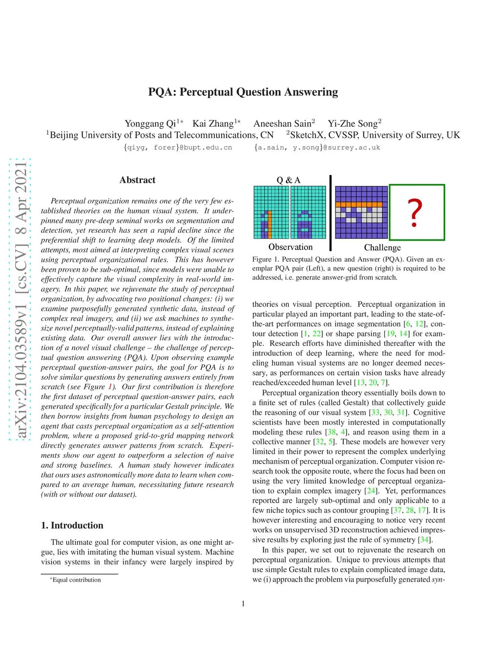 Perceptual organization remains one of the very few established theories on the human visual system. It underpinned many pre-deep seminal works on segmentation and detection, yet research has seen a rapid decline since the preferential shift to learning deep models. Of the limited attempts, most aimed at interpreting complex visual scenes using perceptual organizational rules. This has however been proven to be sub-optimal, since models were unable to effectively capture the visual complexity in real-world imagery. In this paper, we rejuvenate the study of perceptual organization, by advocating two positional changes: (i) we examine purposefully generated synthetic data, instead of complex real imagery, and (ii) we ask machines to synthesize novel perceptually-valid patterns, instead of explaining existing data. Our overall answer lies with the introduction of a novel visual challenge -- the challenge of perceptual question answering (PQA). Upon observing example perceptual question-answer pairs, the goal for PQA is to solve similar questions by generating answers entirely from scratch (see Figure 1). Our first contribution is therefore the first dataset of perceptual question-answer pairs, each generated specifically for a particular Gestalt principle. We then borrow insights from human psychology to design an agent that casts perceptual organization as a self-attention problem, where a proposed grid-to-grid mapping network directly generates answer patterns from scratch. Experiments show our agent to outperform a selection of naive and strong baselines. A human study however indicates that ours uses astronomically more data to learn when compared to an average human, necessitating future research (with or without our dataset).